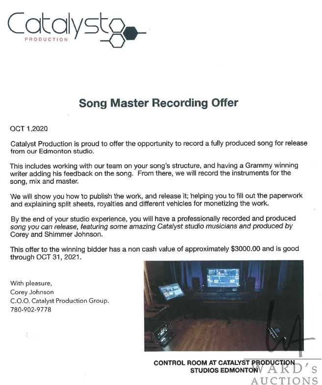 Song Master recording package including working with the Catalyst Production team to record a full produced song for release from their Edmonton Studio, certificate expires October 31, 2021, approximate value $3,000.00. This item is being on behalf of the Support fund for Adults with Disabilities, and will be sold sellers commission free with all monies including applicable buyers premium to be forwarded to the registered charity
