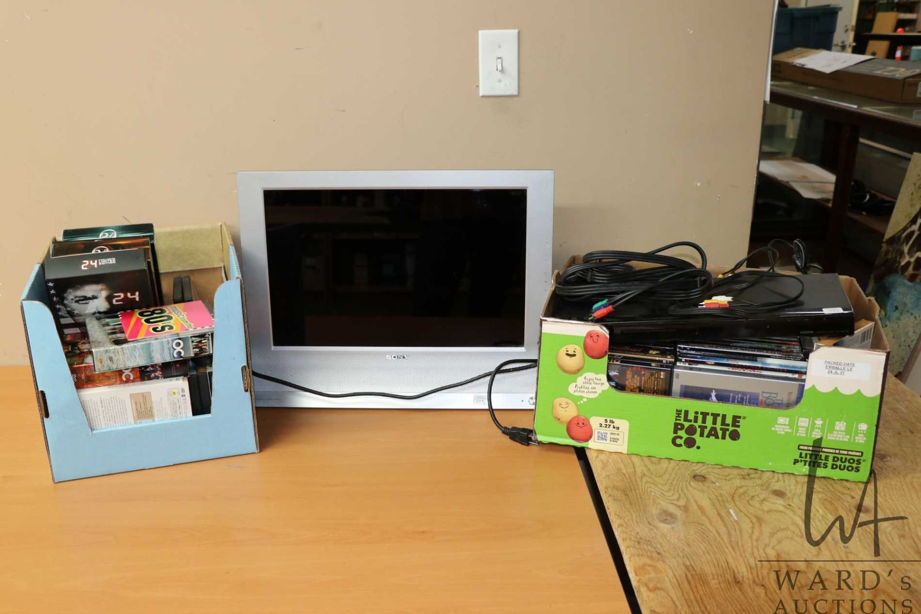 Sony model MFM-HT205 20" television with remote, a Sony DVP-NS718H DVD player plus a large selection of DVD movies and series, all working at time of cataloguing. Note: Artwork cannot be insured and is often too large to ship. Local pickup.