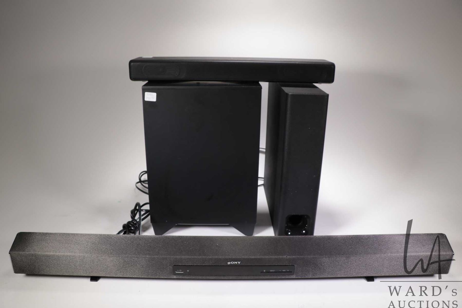Sony wireless speaker system including SA-CT260 H sound bar, SA-WMT300 active sub woofer, SA-MT300 active speaker system and SA-WCT260H active sub woofer and RM-ANP109 remote control, removed from downsizing home, working in home but not tested after removal