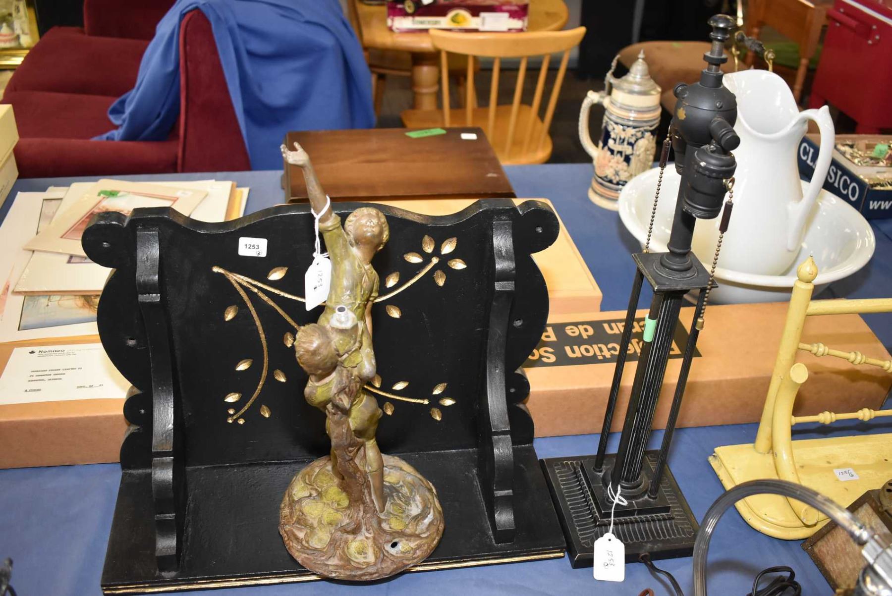 Spelter figural lamp base, column lamp and wooden wall shelf