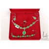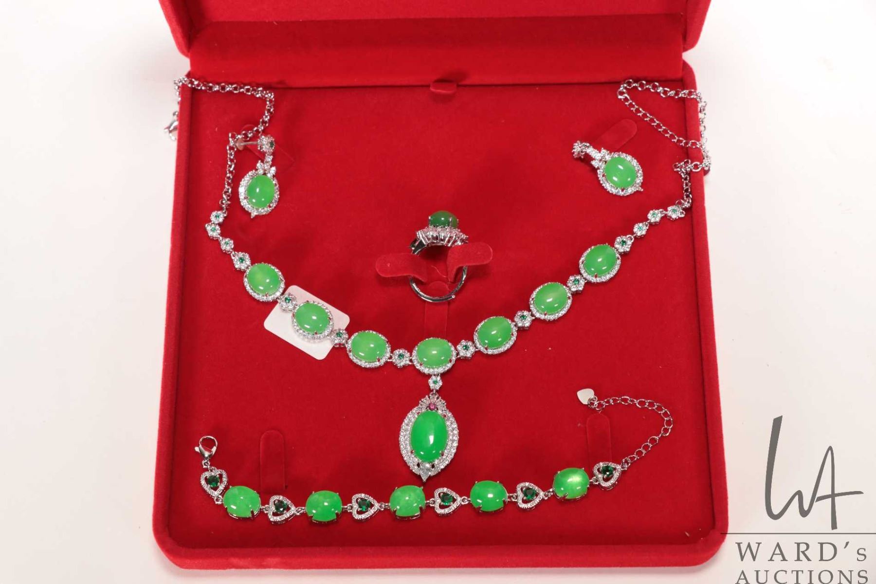 Spinach coloured jadeite suite of jewellery including necklace, earrings, bracelet and ring