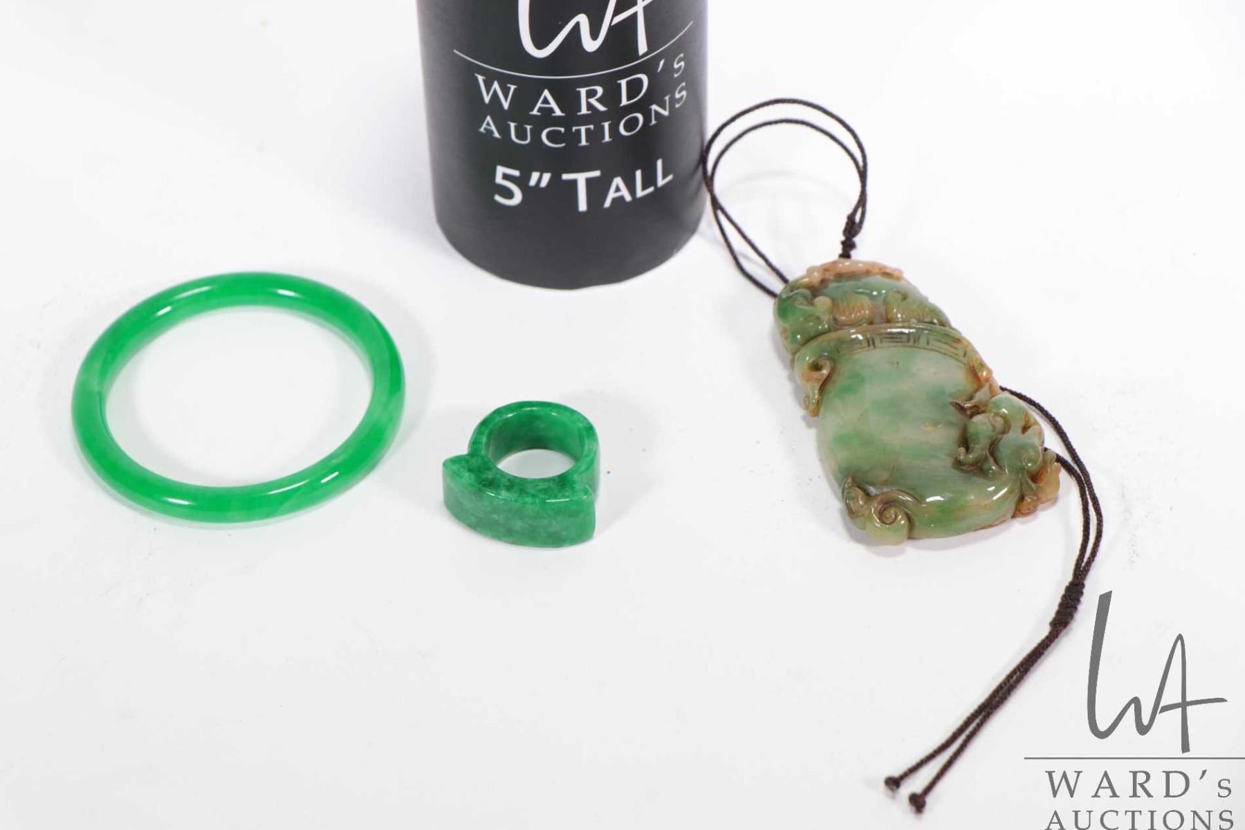Spinach green jadeite bangle and ring plus a green jadeite blessing pendant, purportedly 19th century