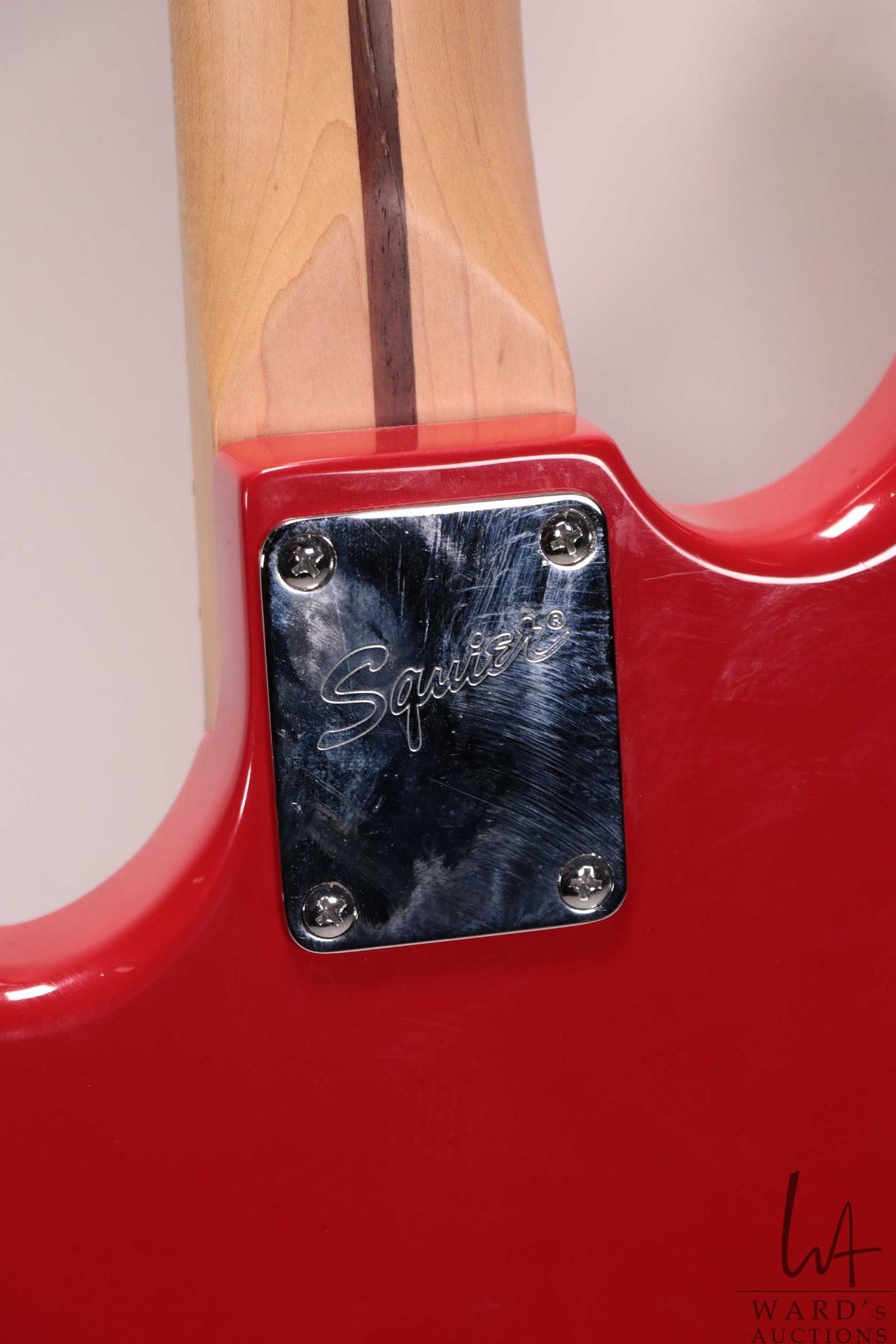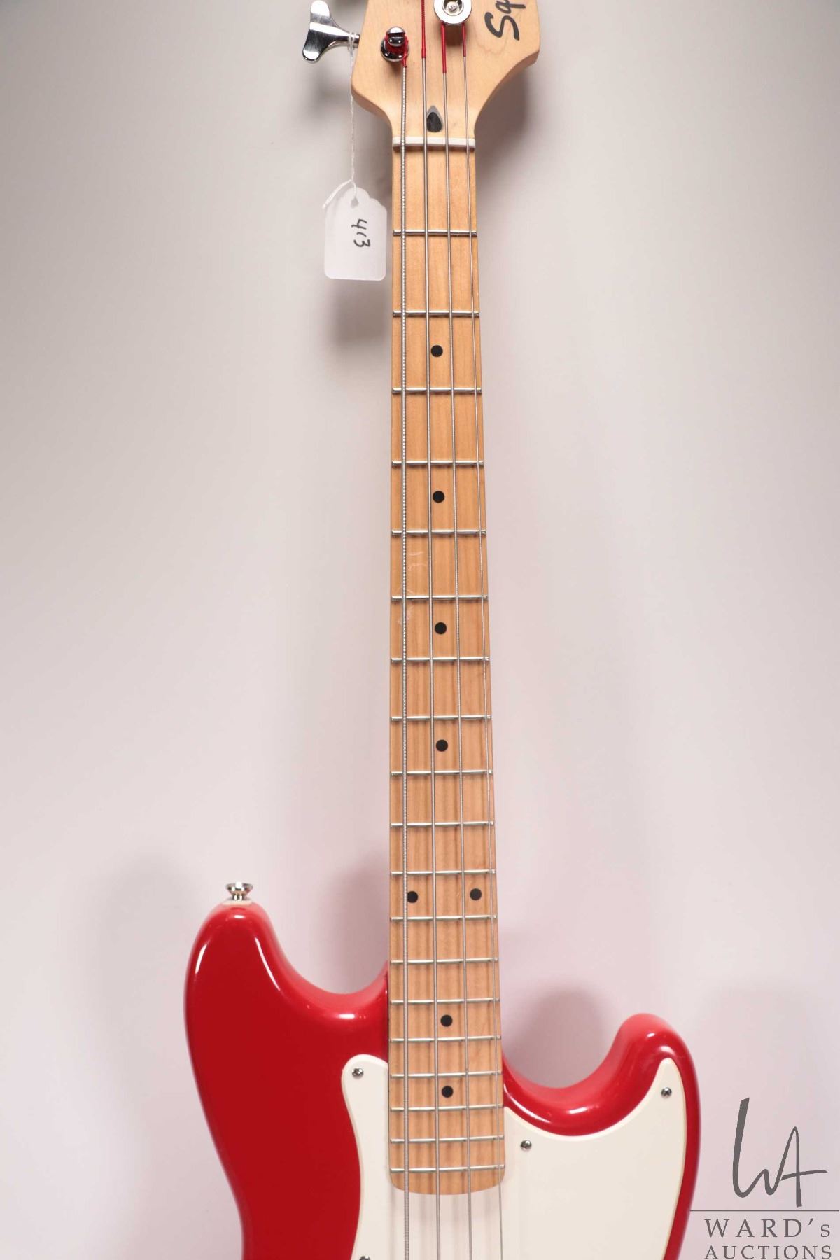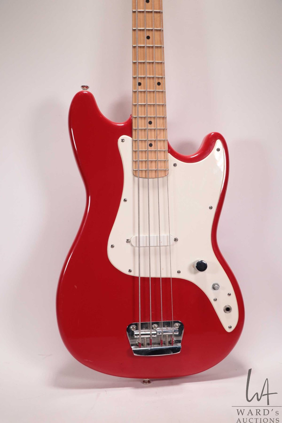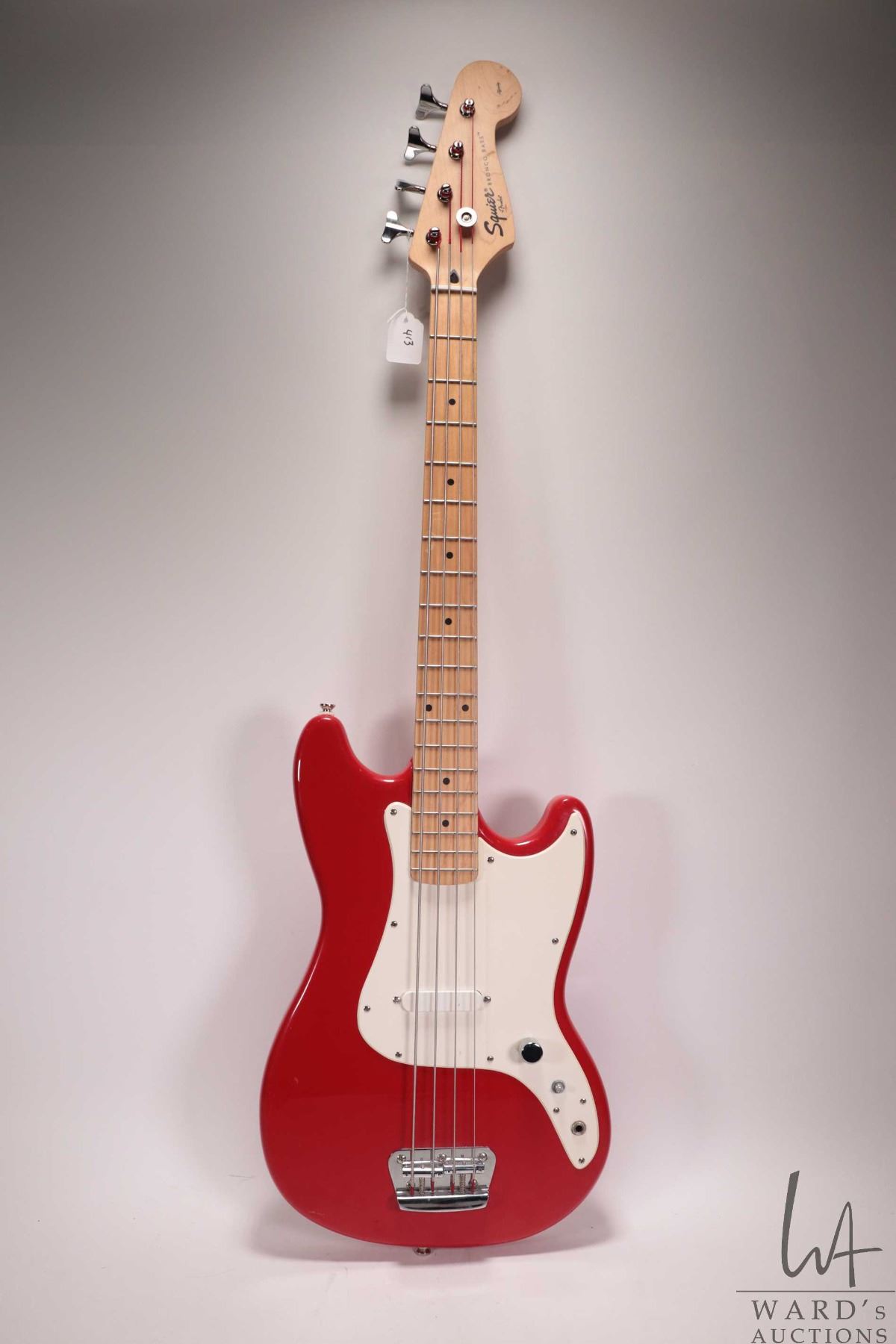 Squire Bronco bass guitar. Fire engine red, sprung bridge, four string, short scale. Note: Missing c