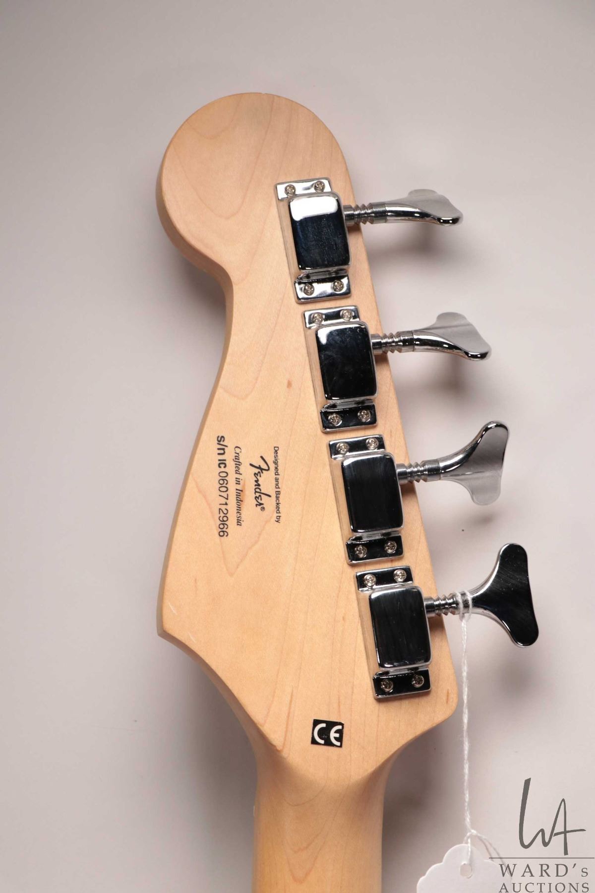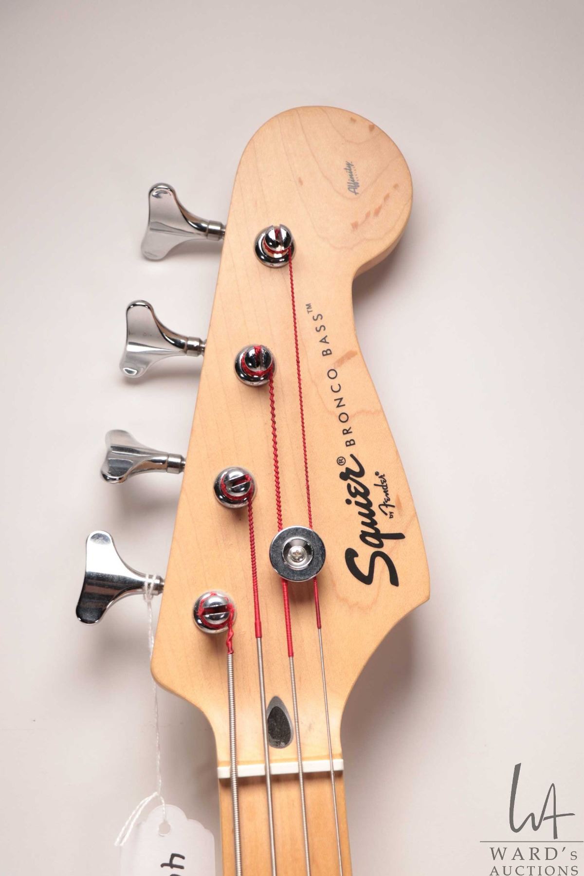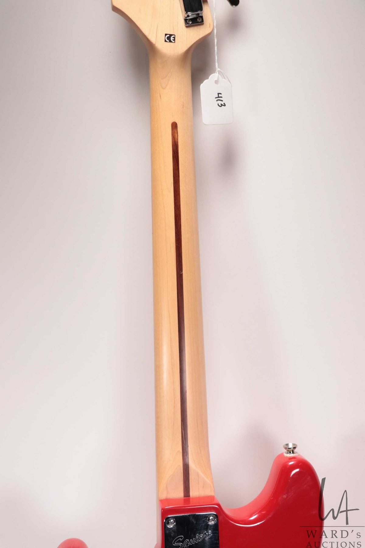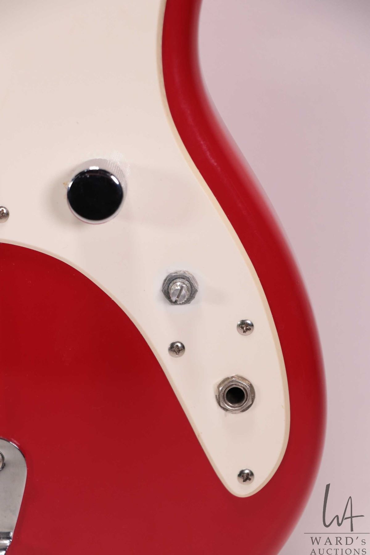 Squire Bronco bass guitar. Fire engine red, sprung bridge, four string, short scale. Note: Missing c