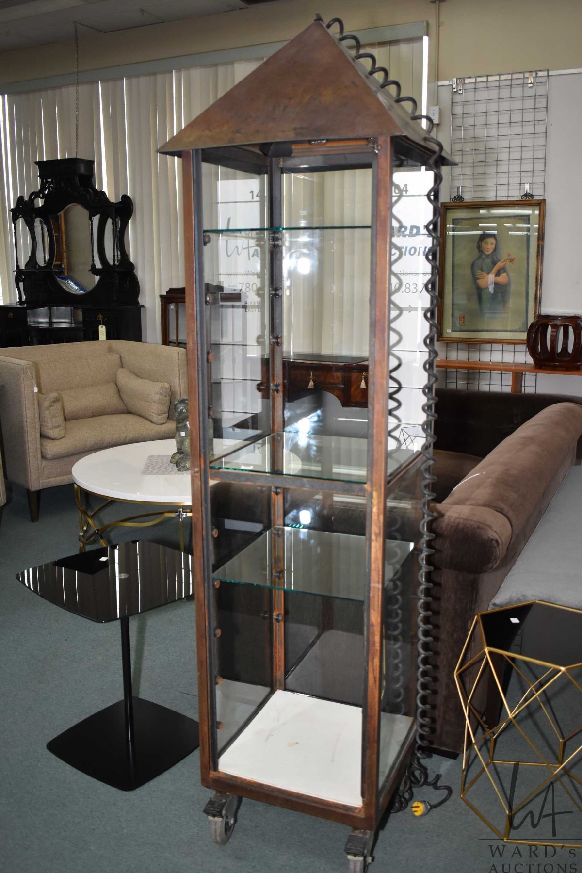 Steam punk style, metal and glass illuminated display cabinet, intended to have single door which is not included 81" in height