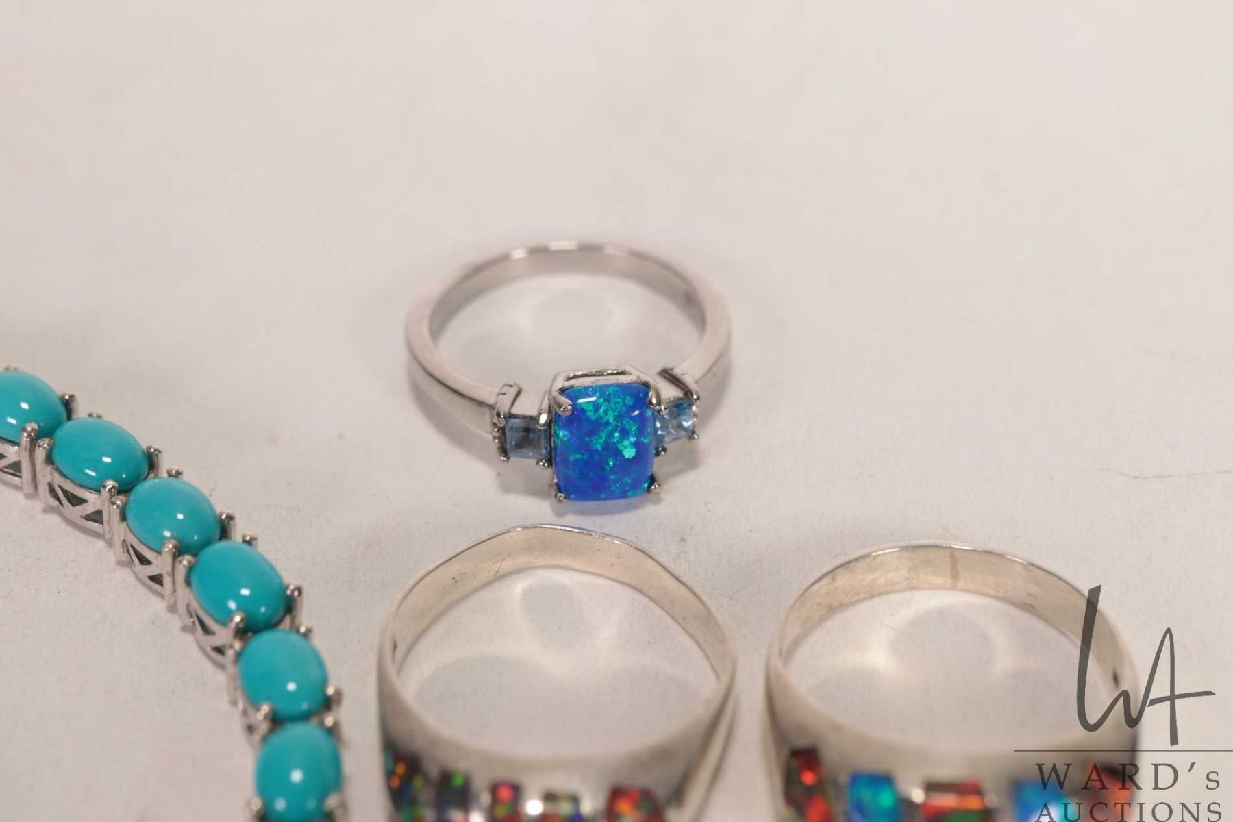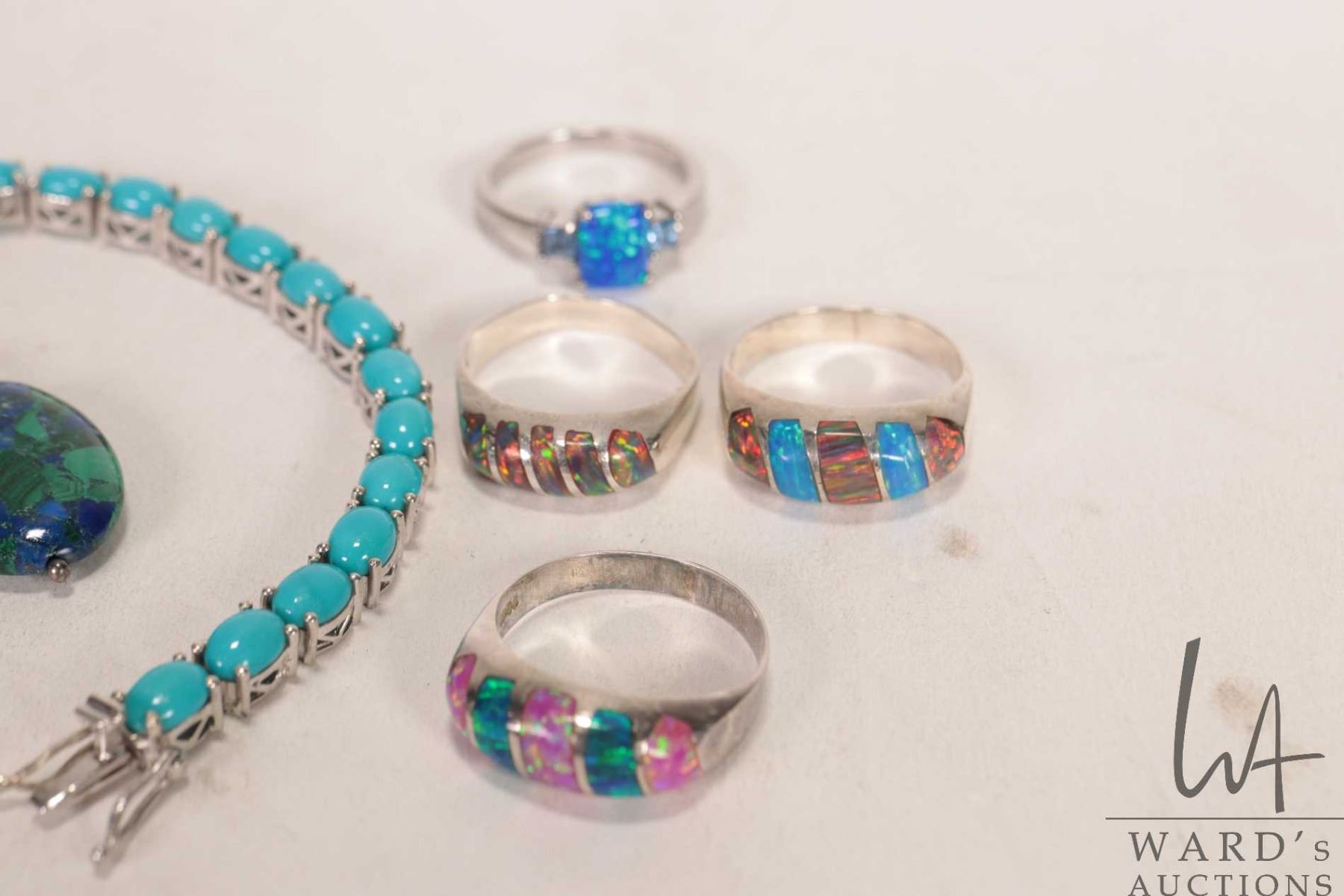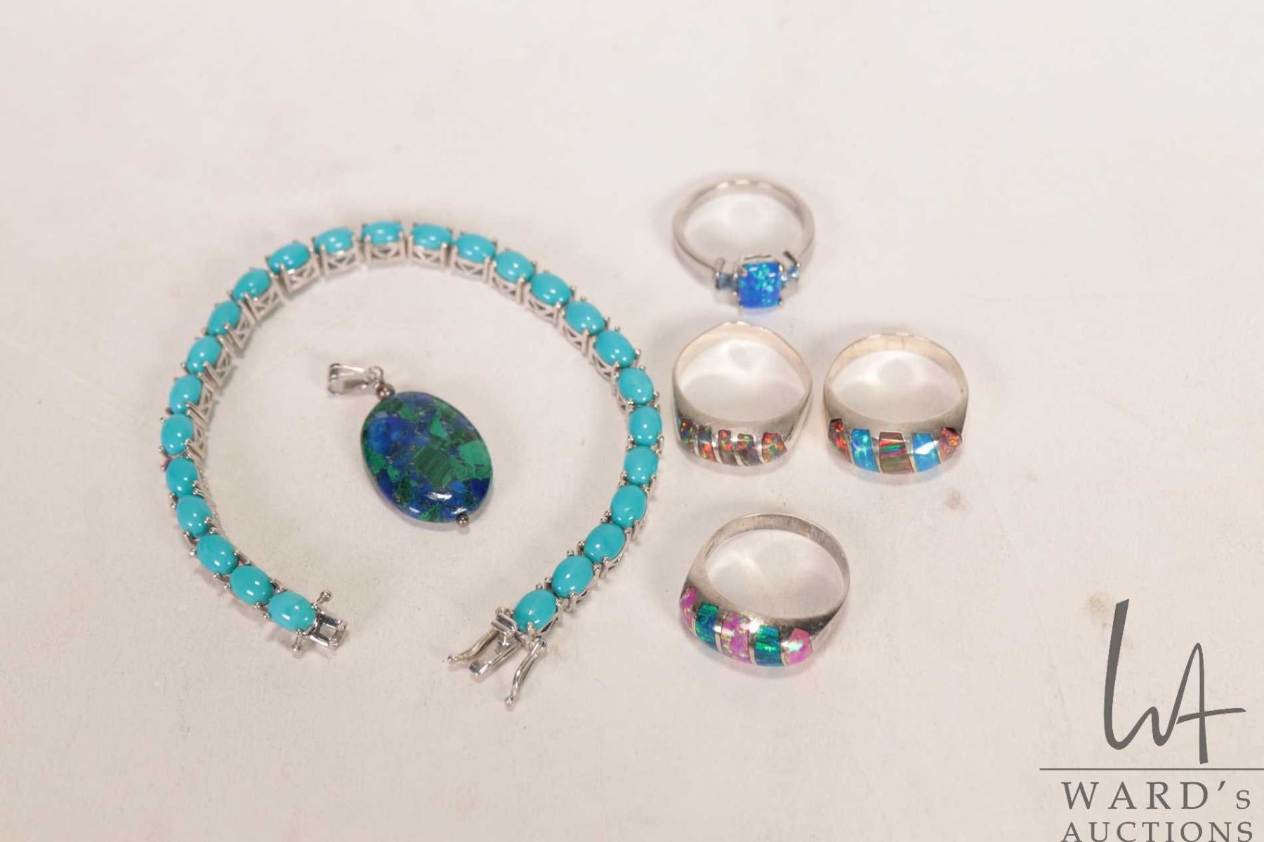 Sterling silver and turquoise/ turquoise like 8" bracelet, stone pendant, size 10 sterling silver ring with polished stone and two electronically tested accent stones plus three Mexican silver rings