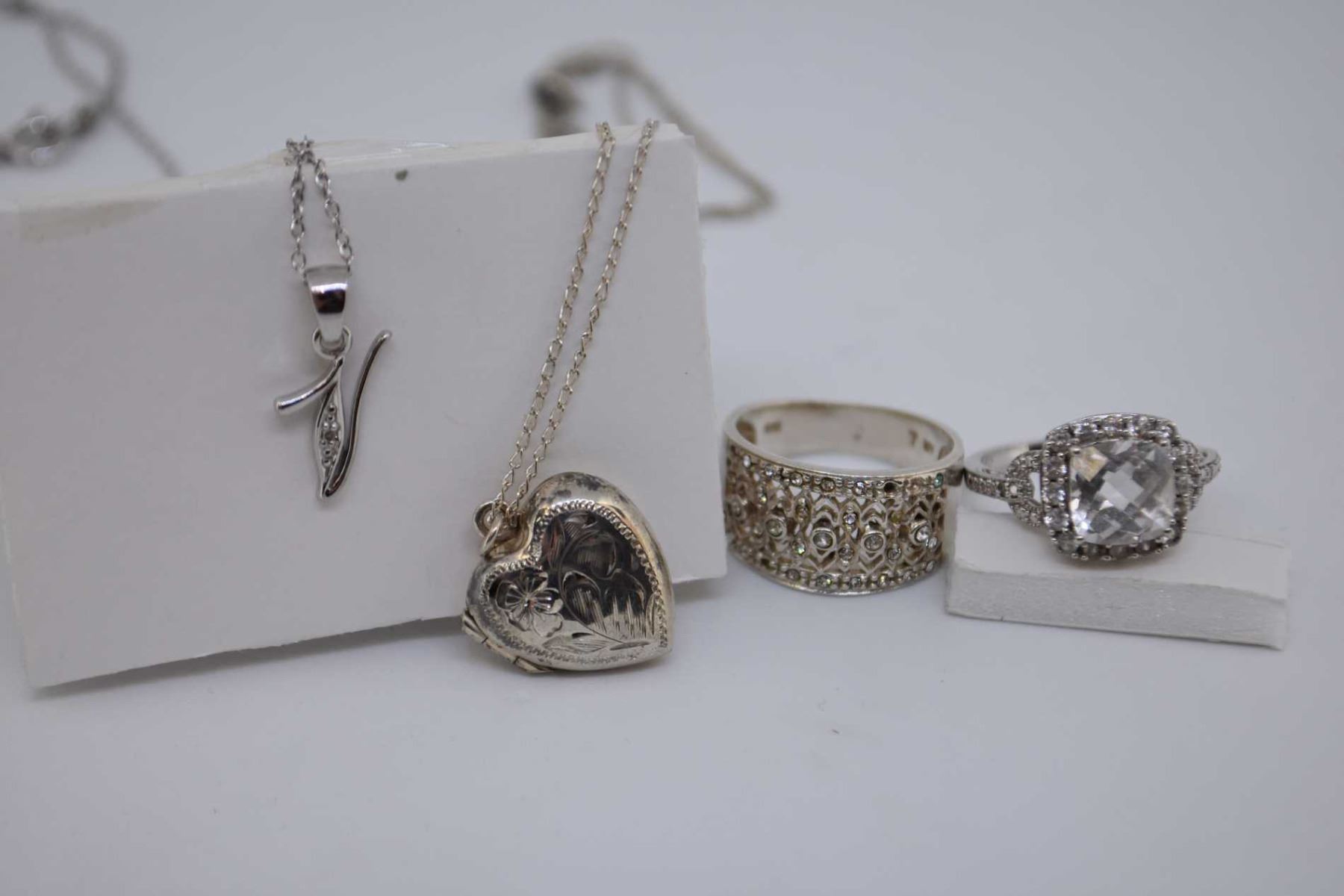Sterling silver heart shaped locket and chain, stylized silver pendant, and two diamante sterling rings