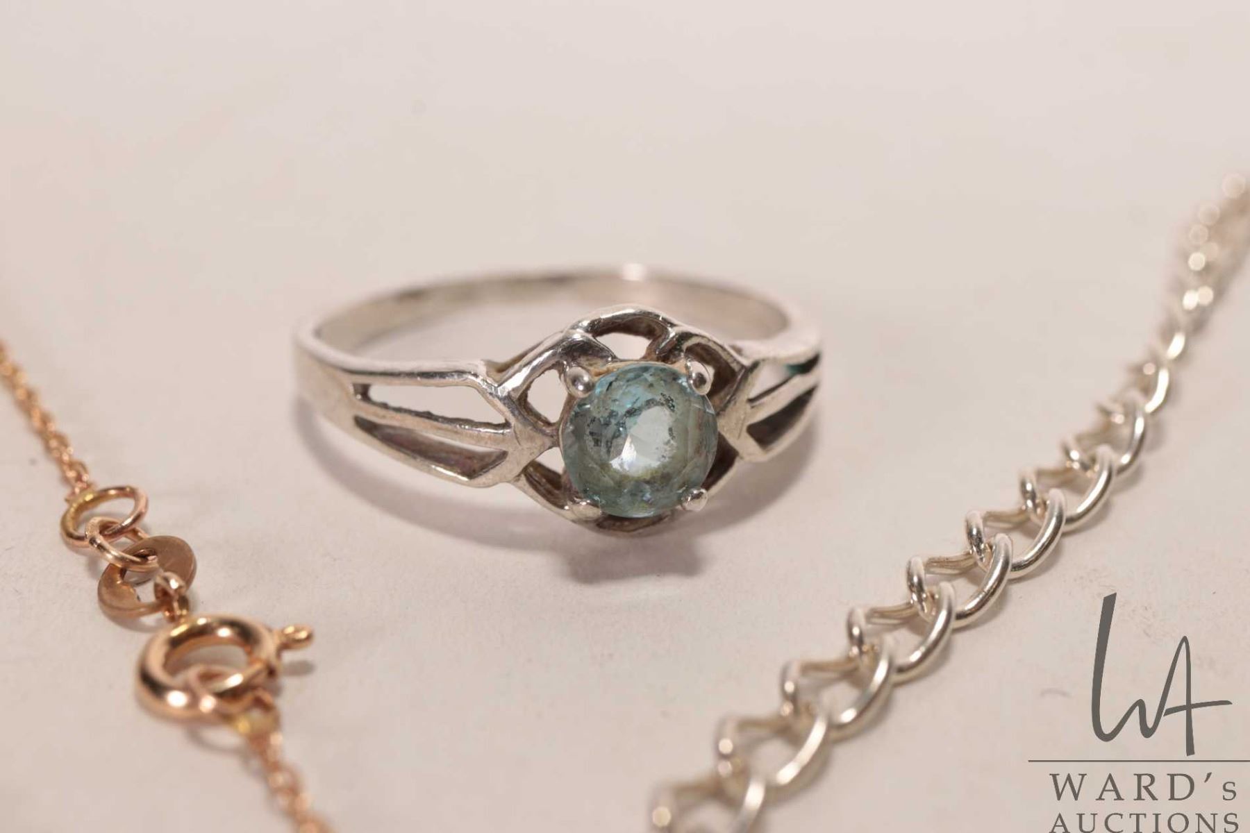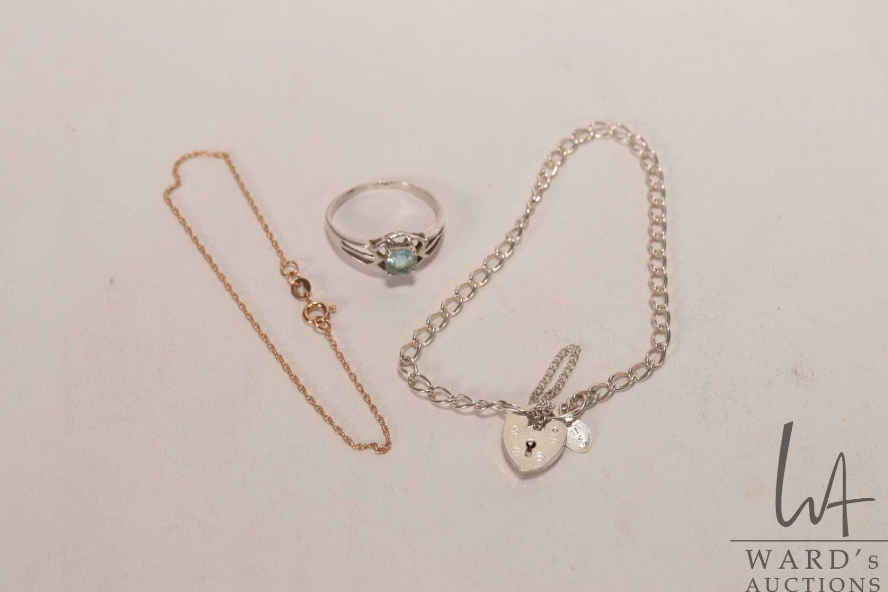 Sterling silver linked bracelet with heart shaped locket fastener, a 10kt yellow gold linked bracelet and a sterling silver ring set with blue gemstone