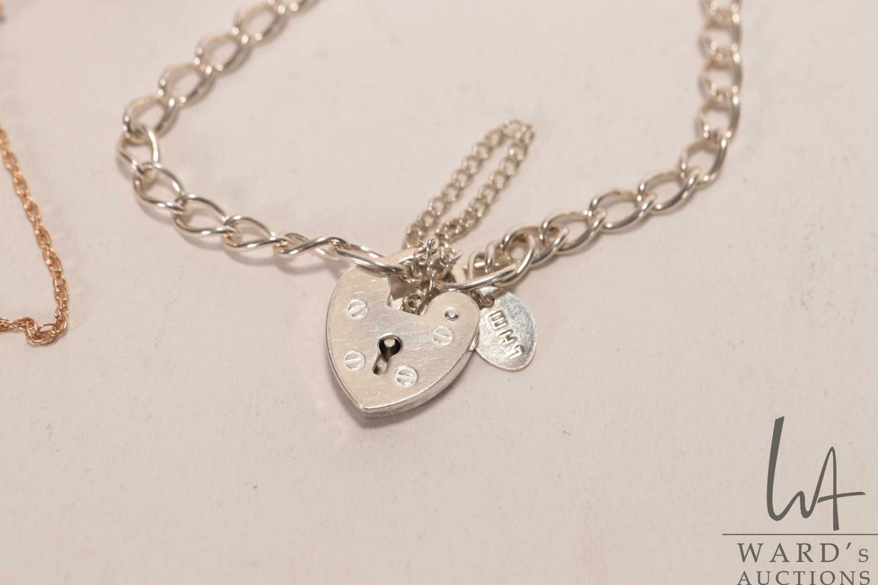 Sterling silver linked bracelet with heart shaped locket fastener, a 10kt yellow gold linked bracele