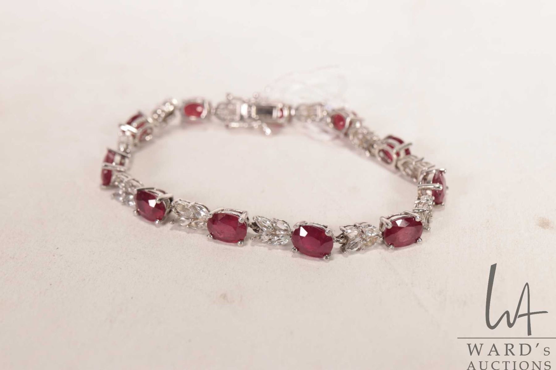 Sterling silver tennis bracelet set with ruby/ ruby like electronically tested gemstones, 7" in length