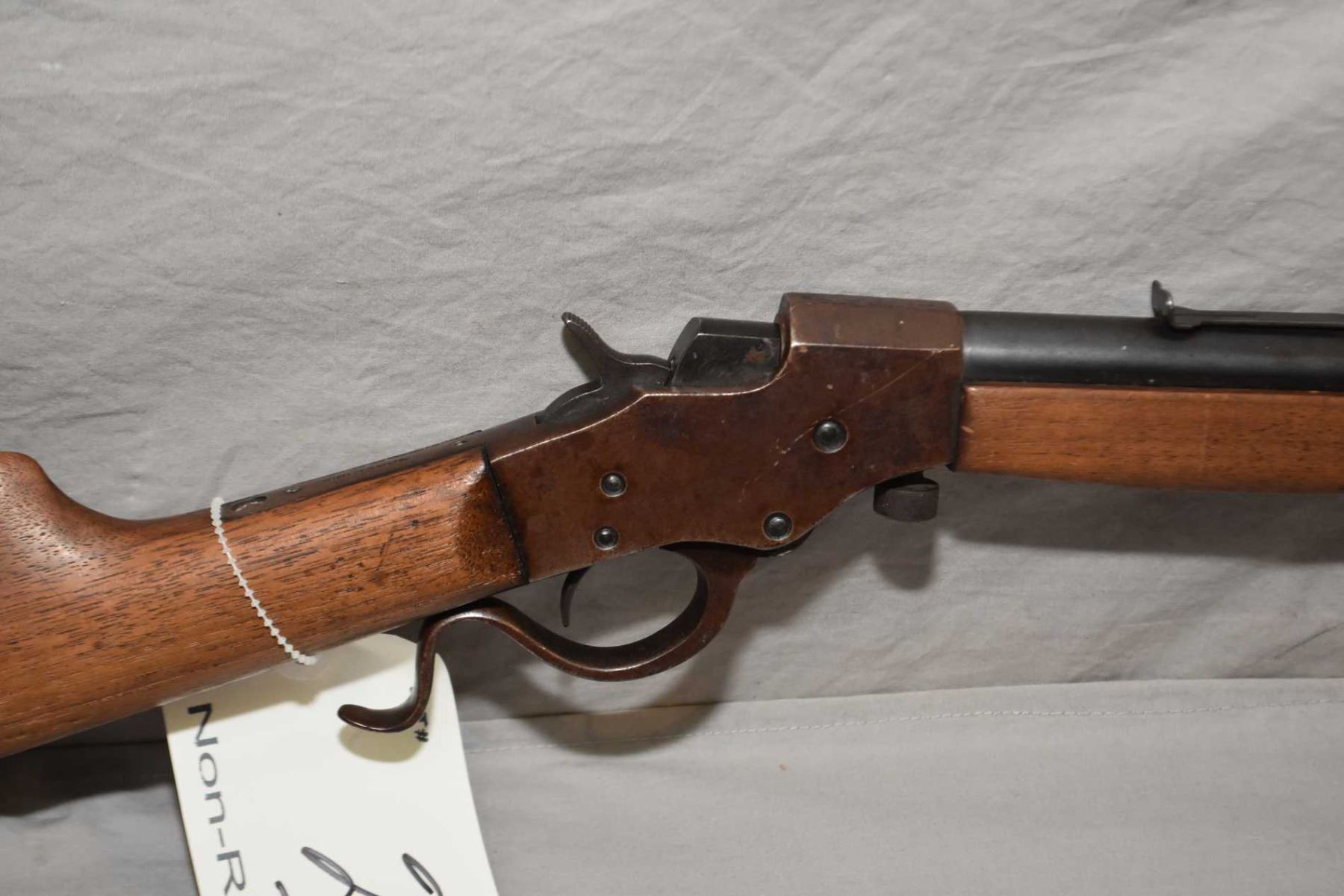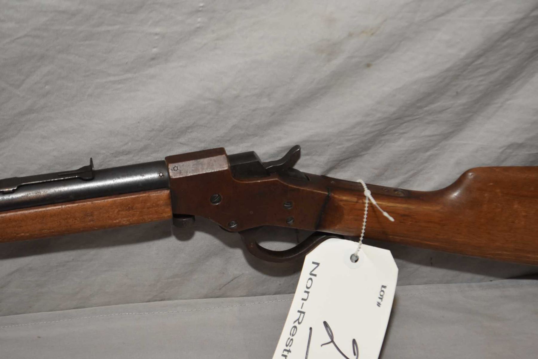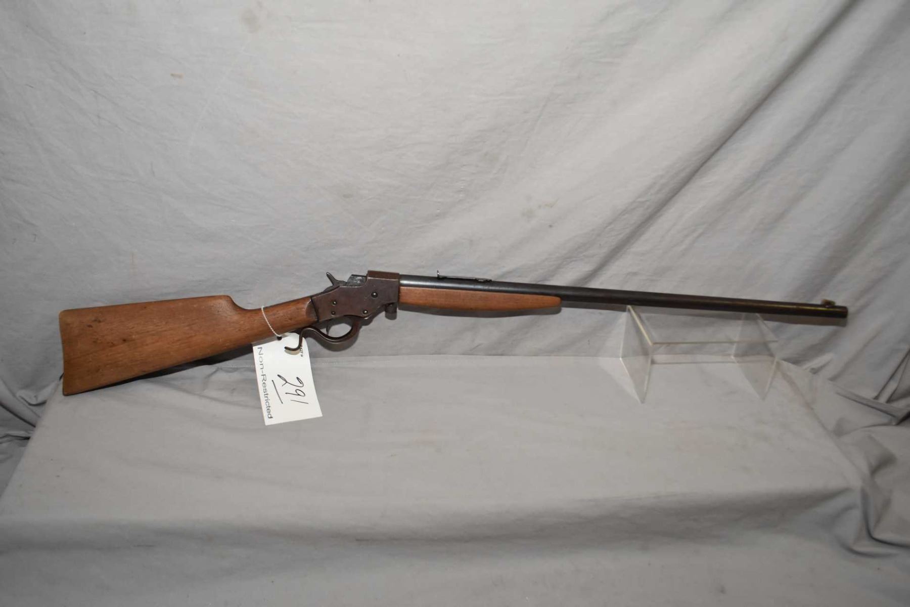 Stevens Model 1915 Favorite .25 Stevens Cal Single Shot Rifle w/ 24" bbl [ fading blue finish, turning brown in some areas, some light pitting and rust, barrel sights missing the lift, wooden stock with some marks and gouge on left side, missing the butt plate and screws ] Ser # N381