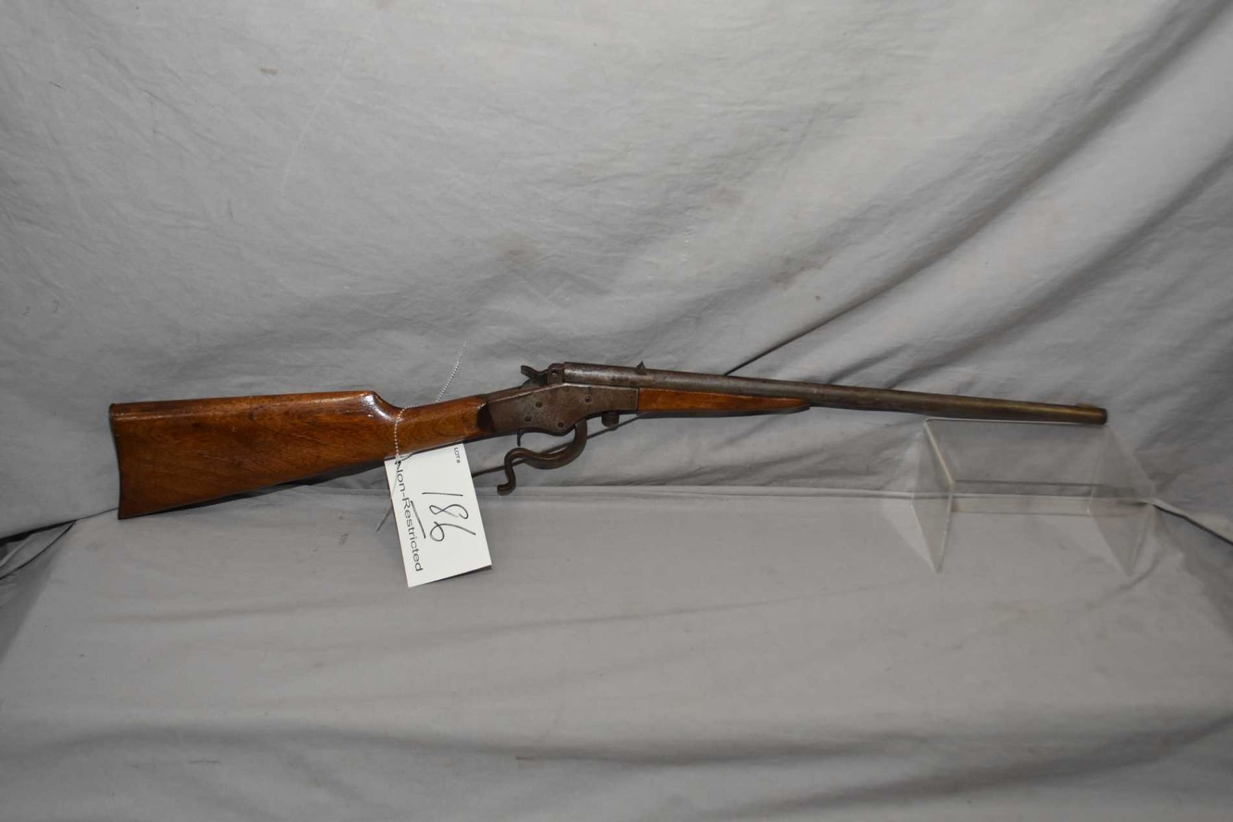 Stevens Model Crack Shot - 26 .22 Long Rifle Cal Single Shot Falling Block Rifle w/ 18" round bbl [ faded blue finish, turned mostly to grey, with some brown patches, barrel sights, revarnished wood with metal butt plate, some marks and scratches, Note : Missing the firing pin, spring and bolt that holds it all together ] Ser # Nil