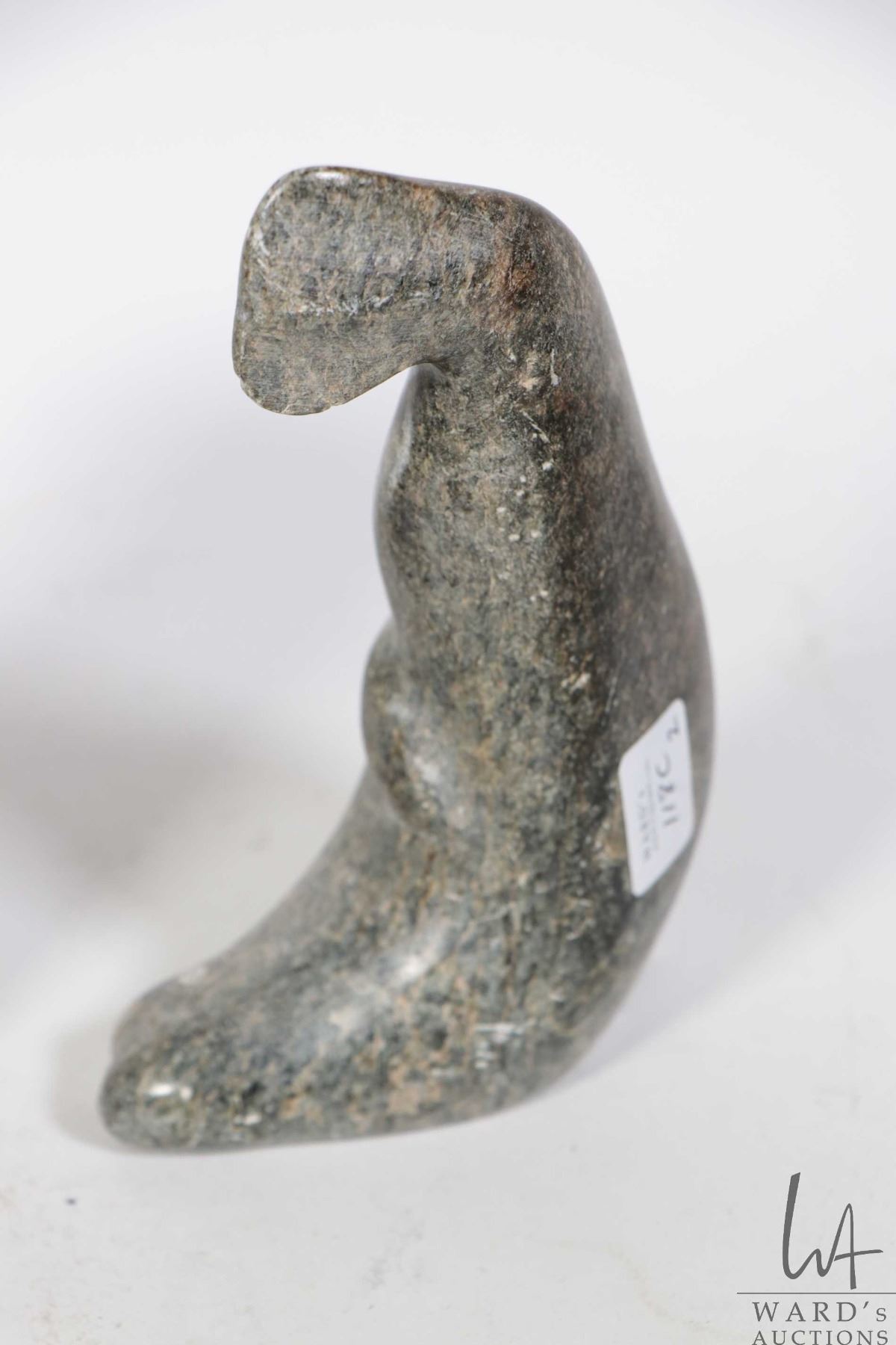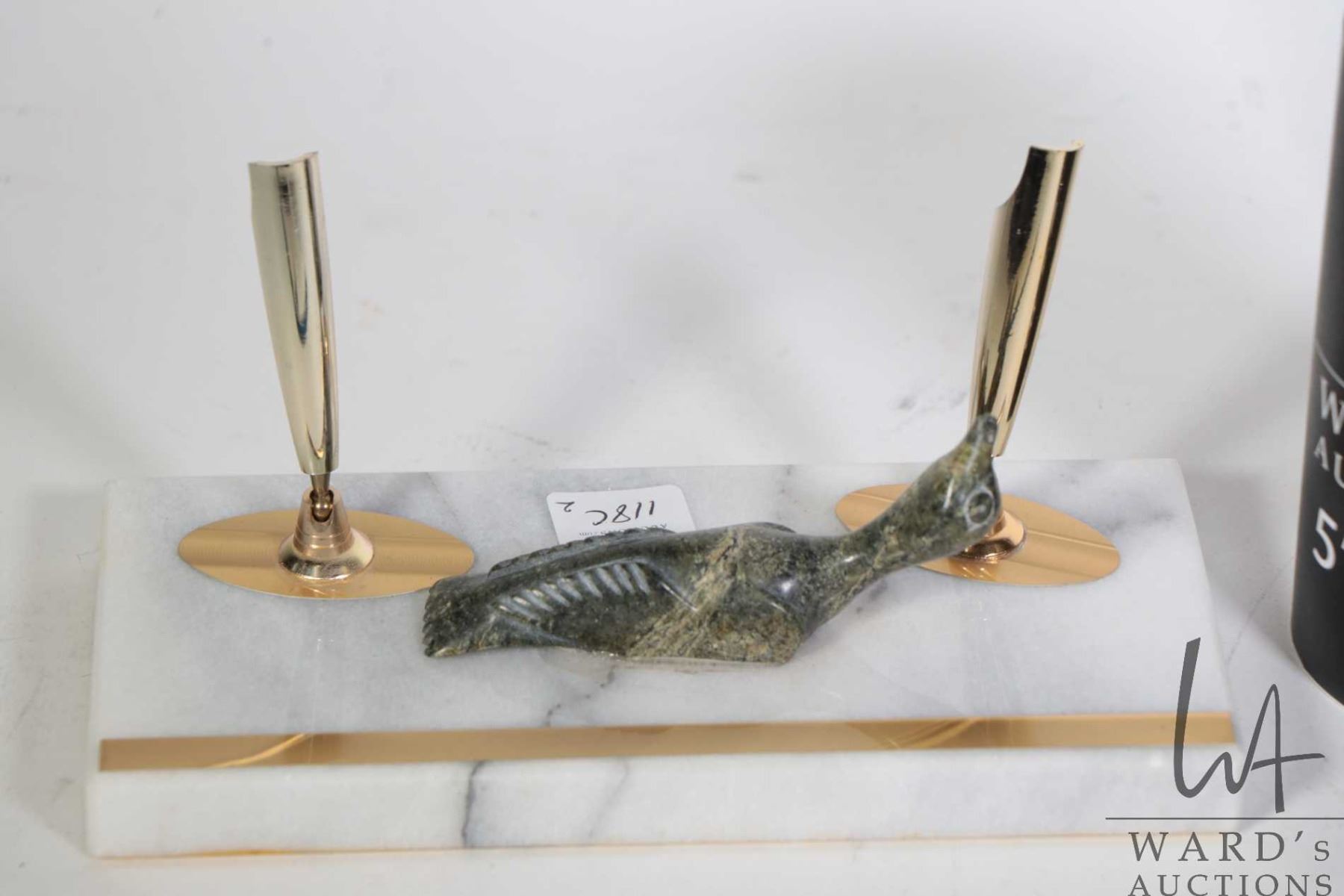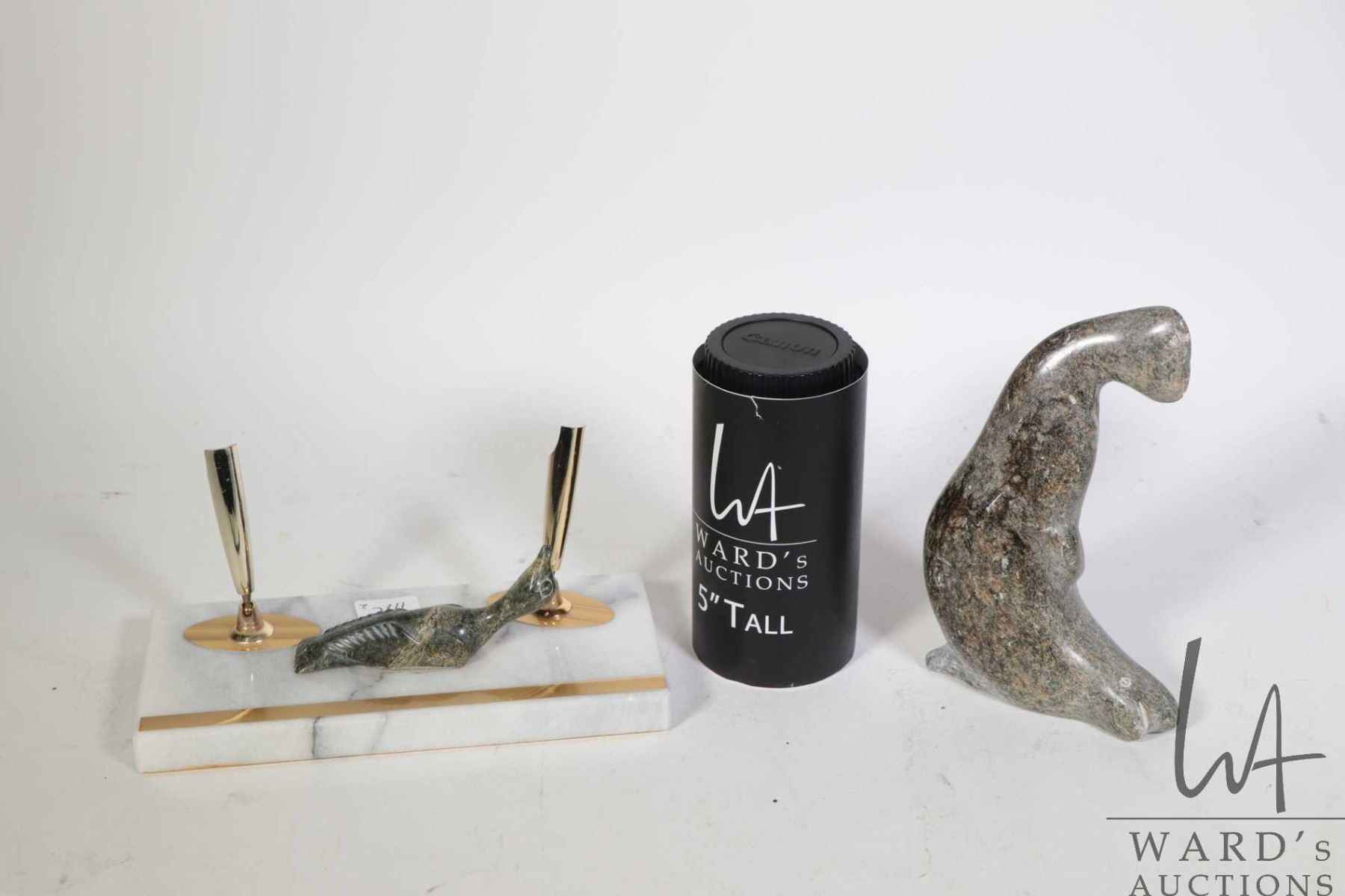 Stone pen holder with Inuit bird carving and a soapstone whale carving signed by artist Sila Kelly 6 1/2" tall