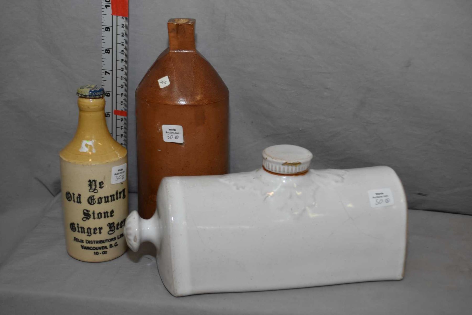 Stoneware pig plus stoneware ink bottle 10  in height plus a ginger beer bottle