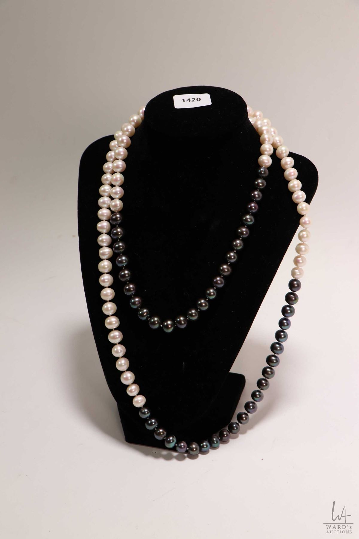 Strand of genuine pearls including 7-9mm freshwater and 7-9mm Tahitian style pearls, 21" in length