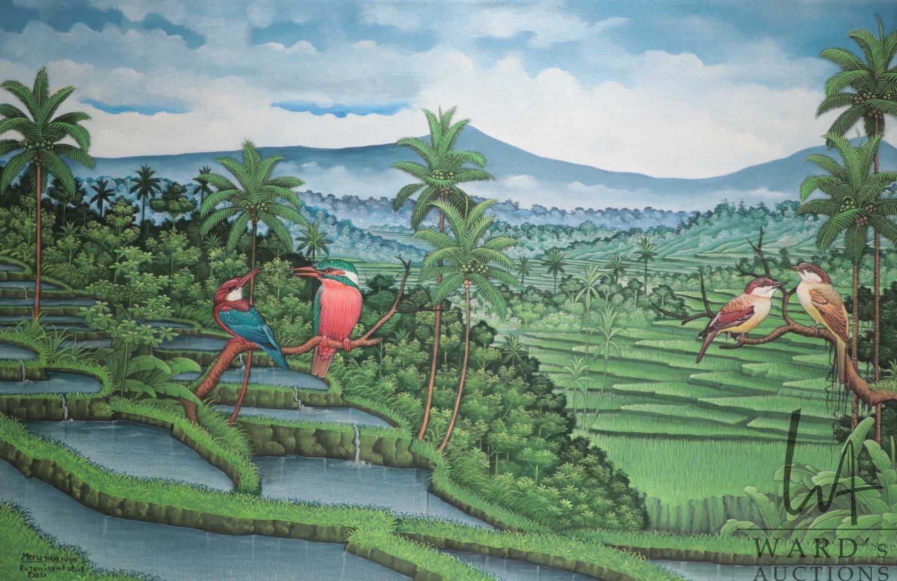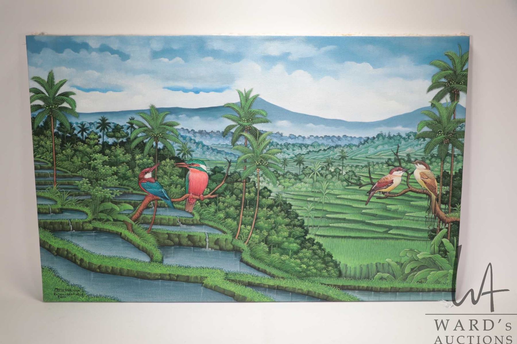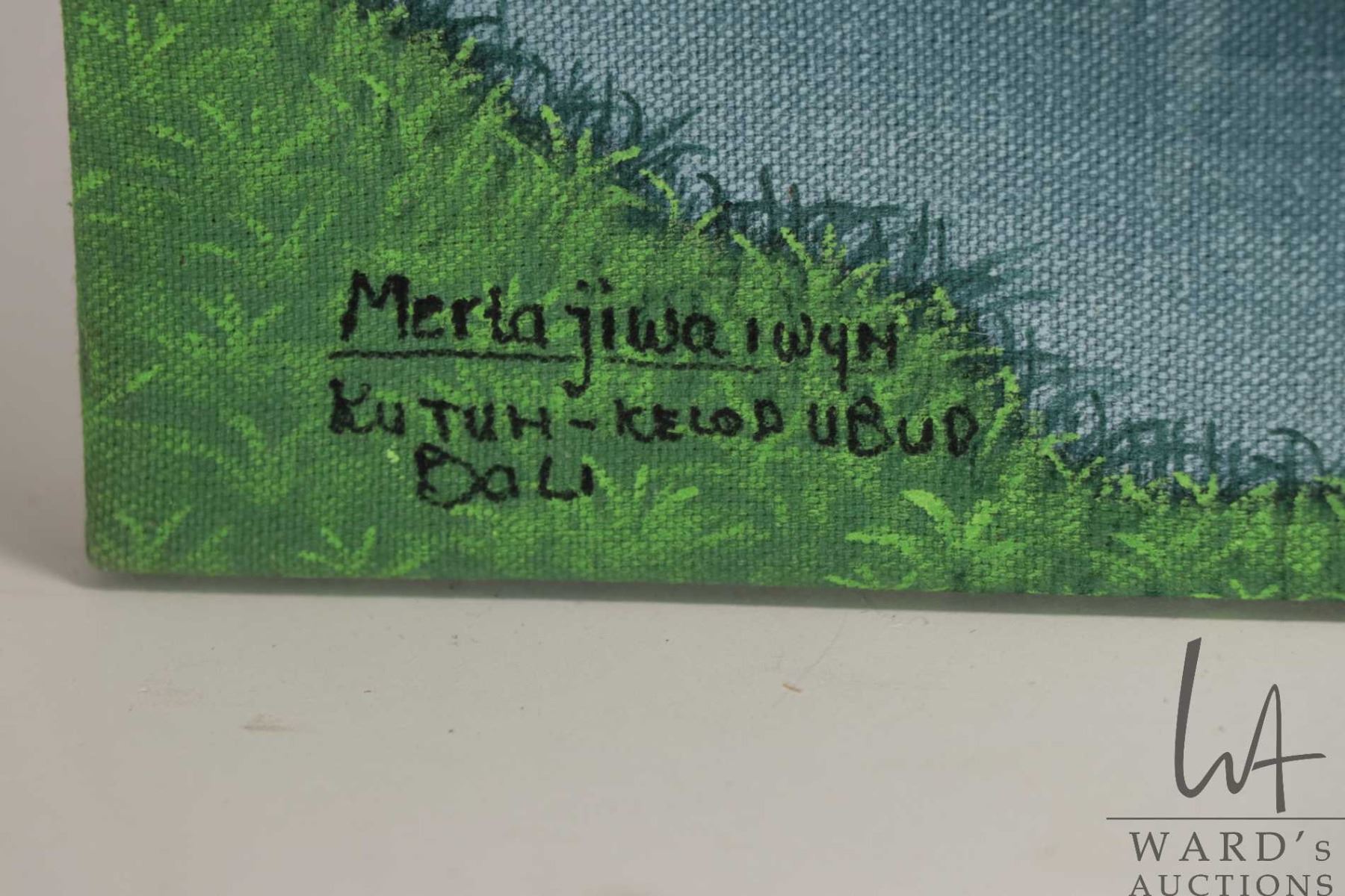 Stretcher frame acrylic on canvas painting titled "Kuth-Kelod Ubud, Bali", signed by artist Meria jiwa iwyn. Note: Not available for shipping. Local pickup only