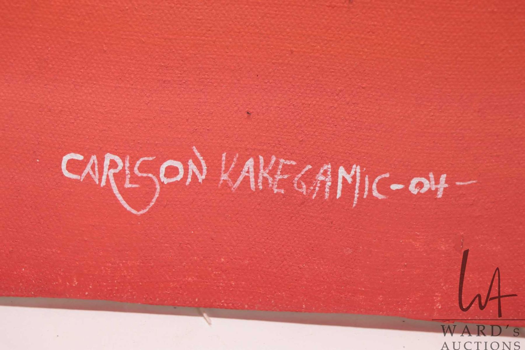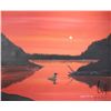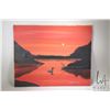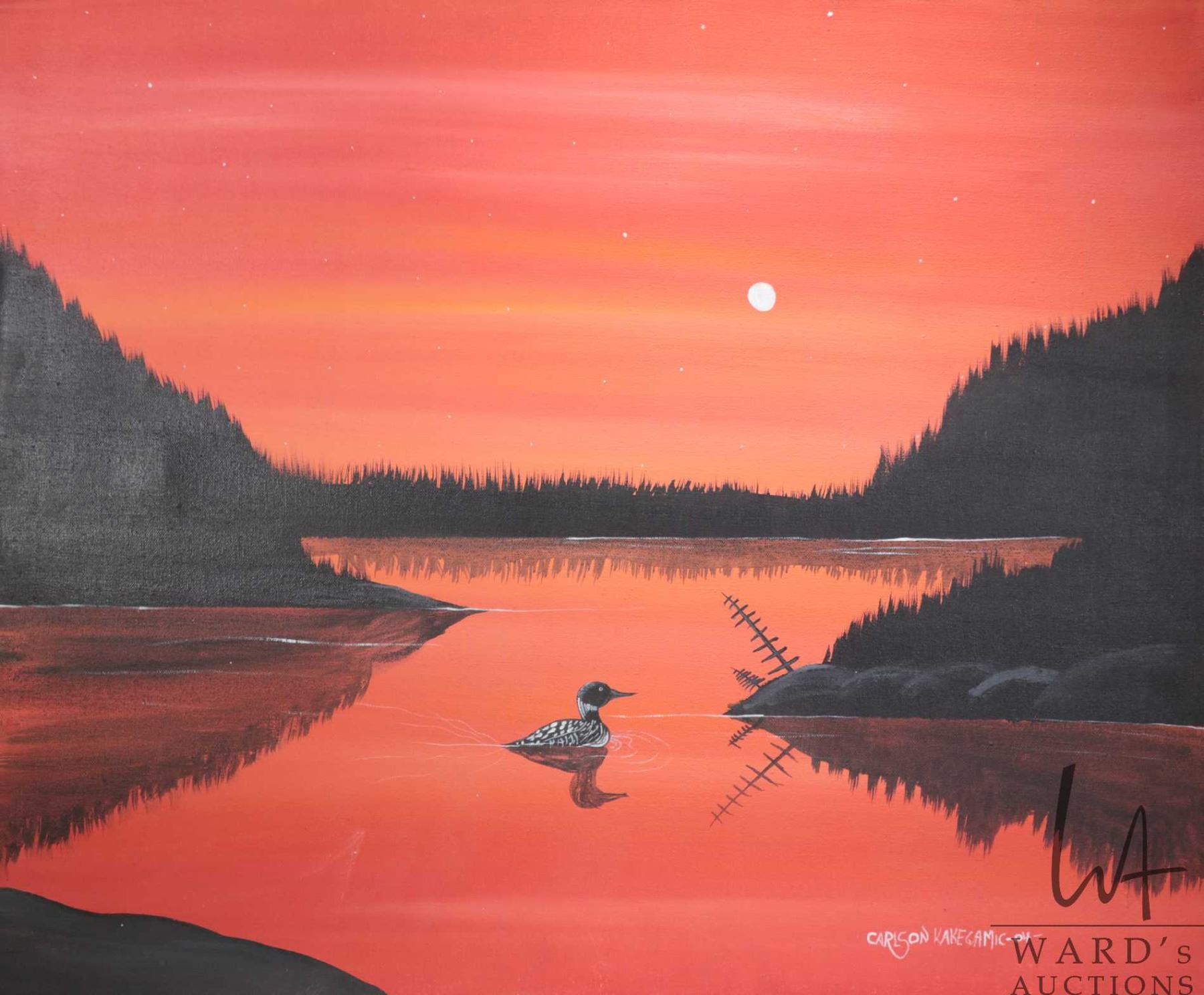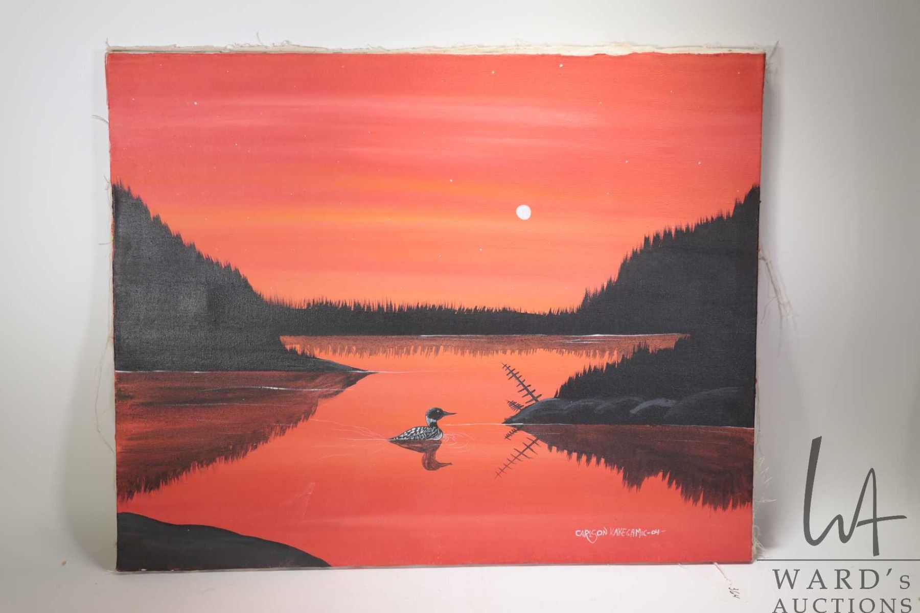 Stretcher framed acrylic on canvas painting of a loon on a lake, purported by Asishinaabe artist Carlson Kakegamic, 24" X 30". Note: Not available for shipping. Local pickup only