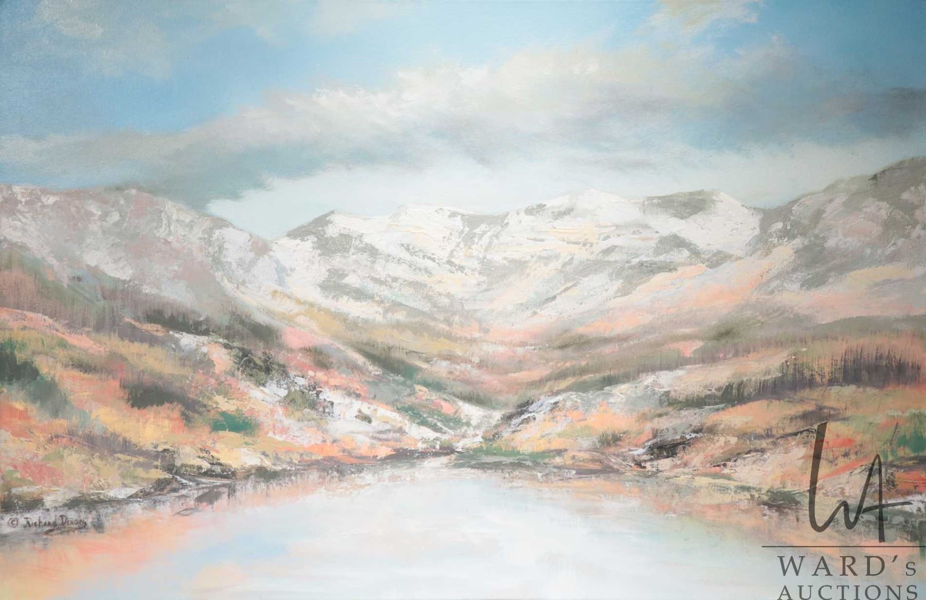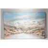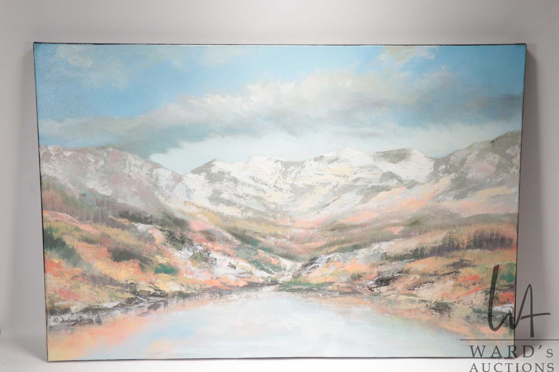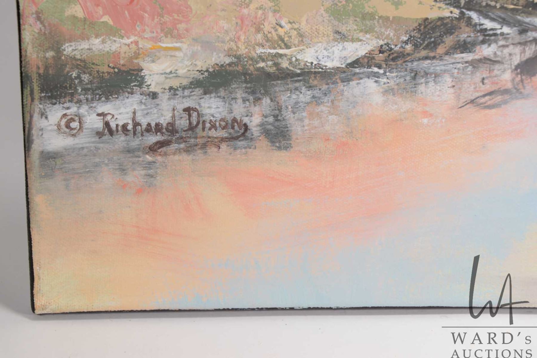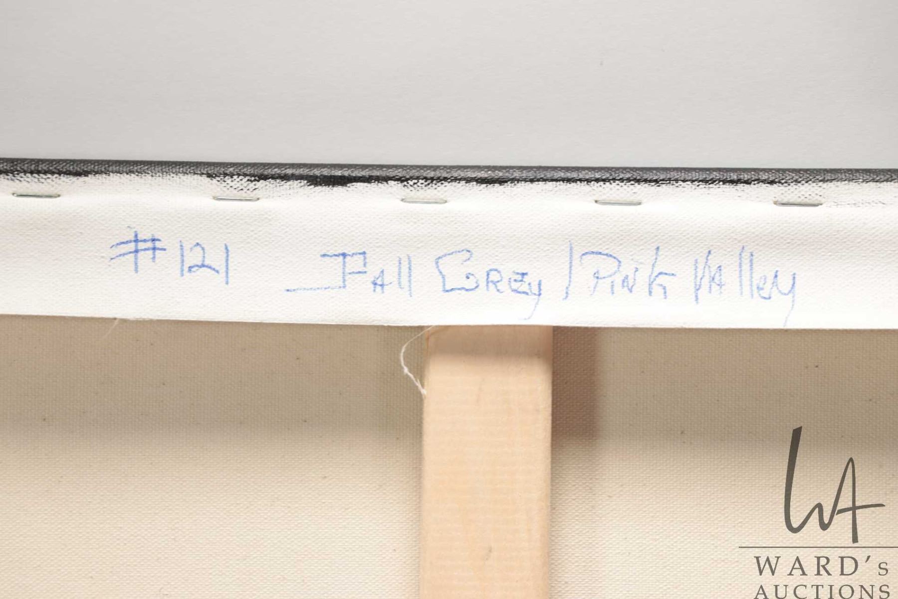 Stretcher framed acrylic on canvas paintint titled "Fall Grey/ Pink Valley" and signed by artist Richard Dixon, 24" X 36". Note: Artwork cannot be insured and is often too large to ship. Local pickup.