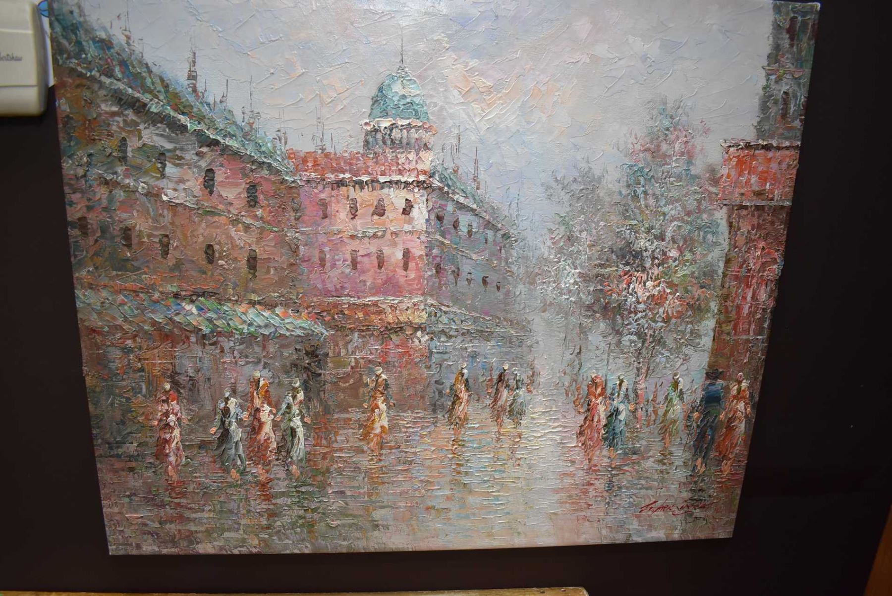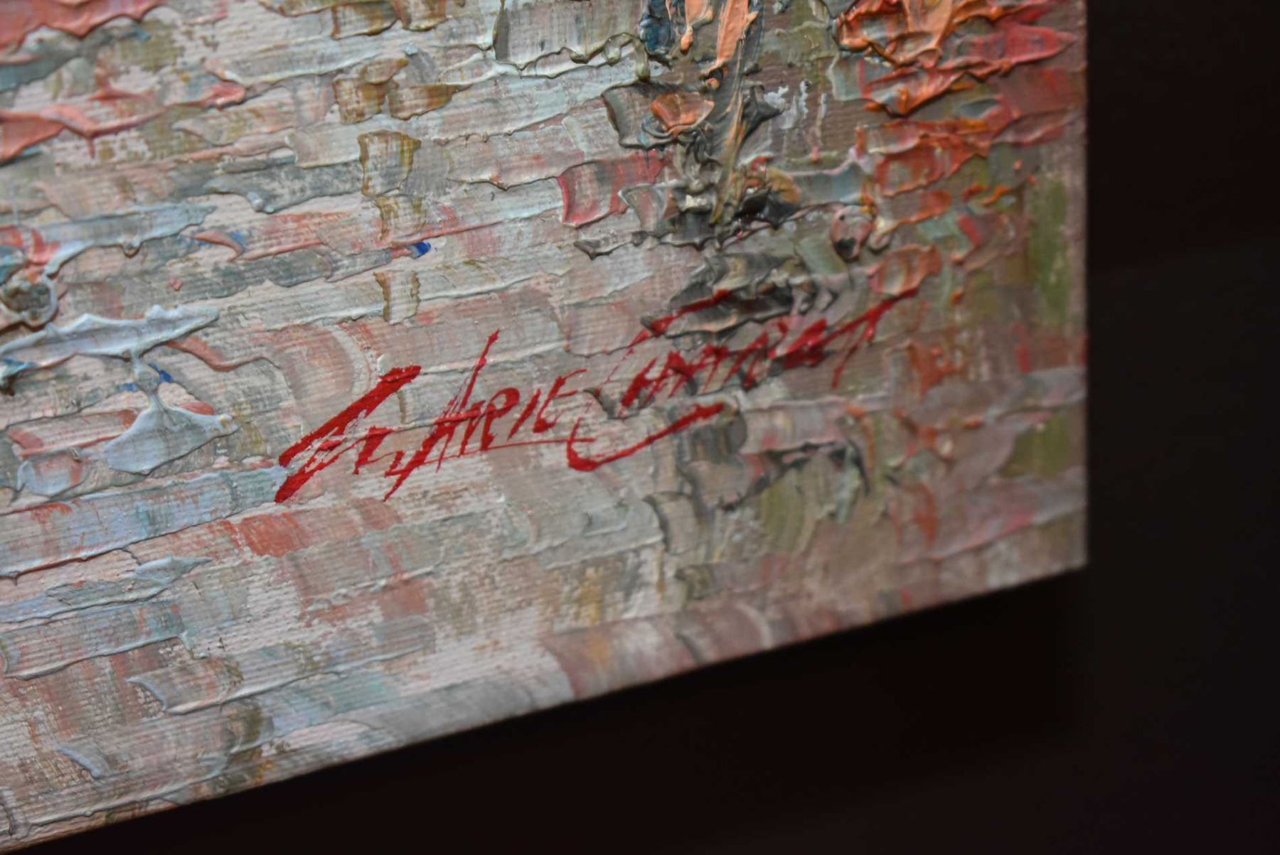 Stretcher framed acrylic on canvas pallet painting of a street scene signed by artist Arie Charet (?) 20" x 24"