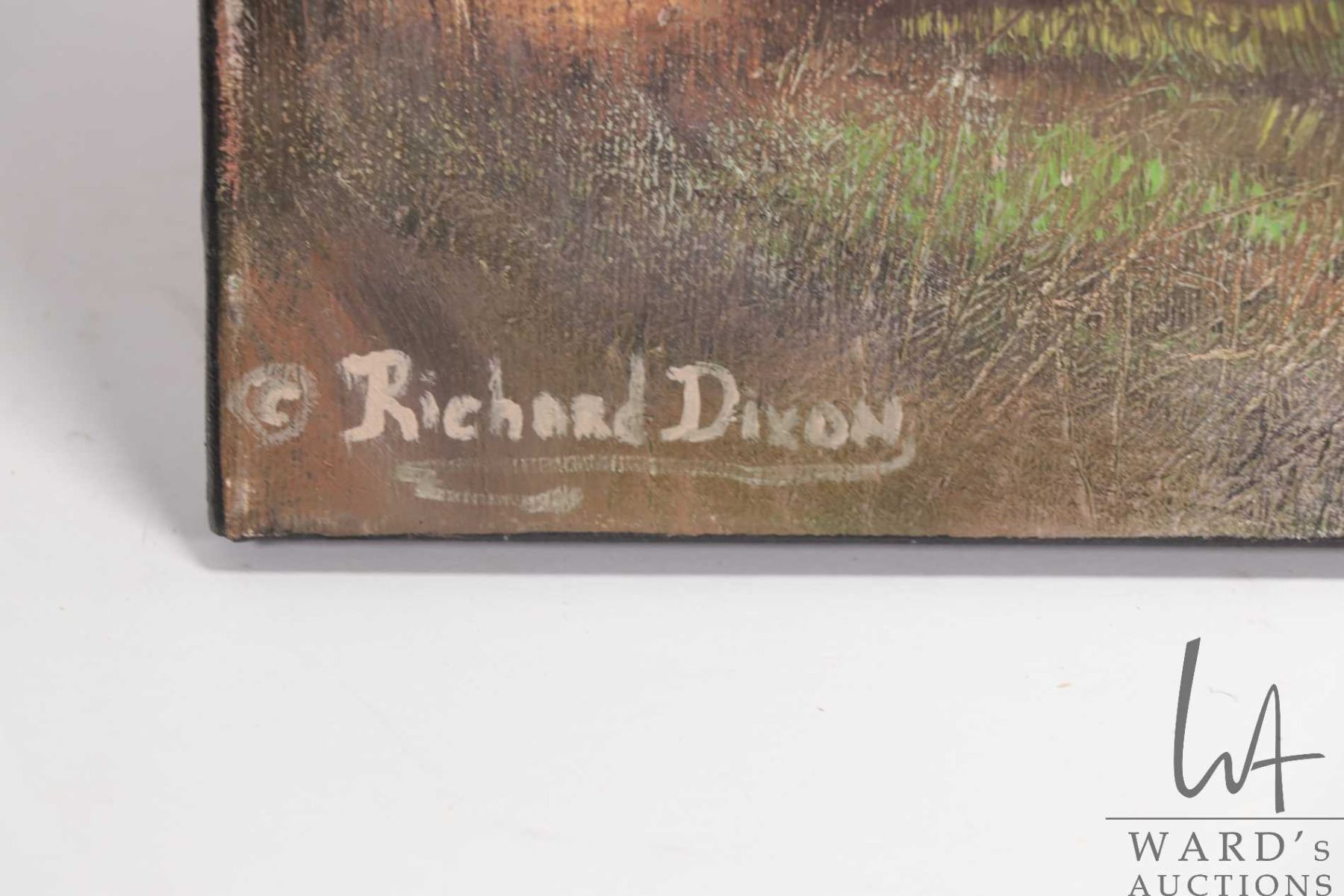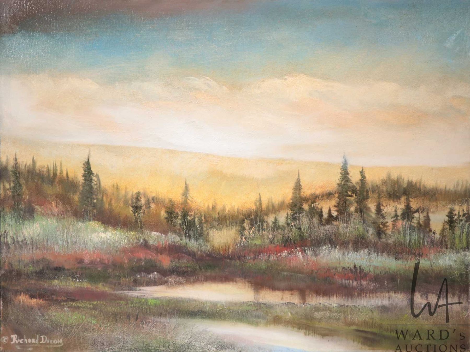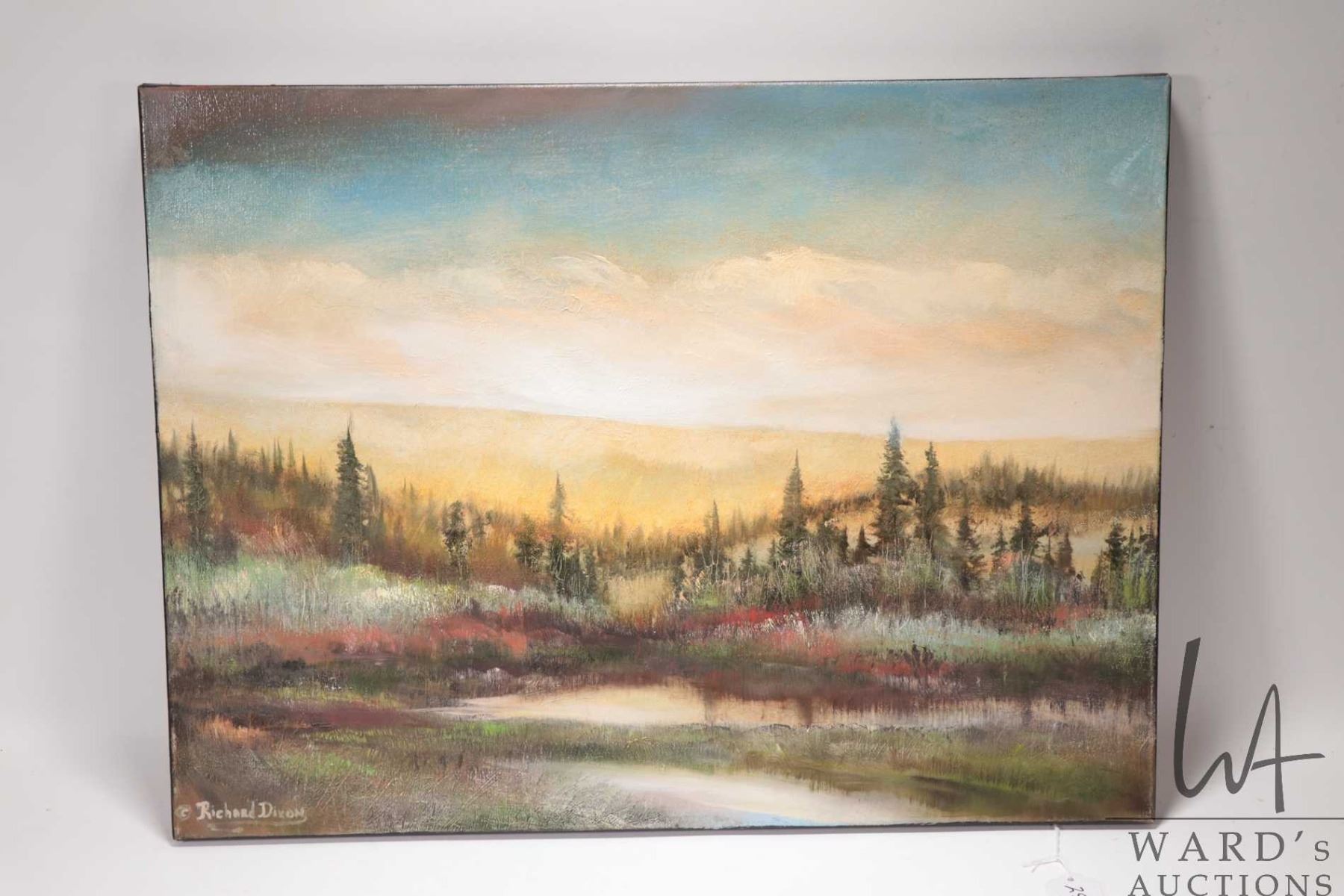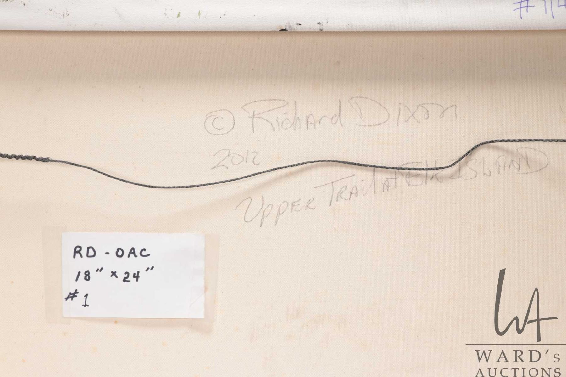 Stretcher framed acrylic on canvas print titled "Upper Trail at Elk Island", signed by artist Richard Dixon, 18" X 24". Note: Artwork cannot be insured and is often too large to ship. Local pickup.
