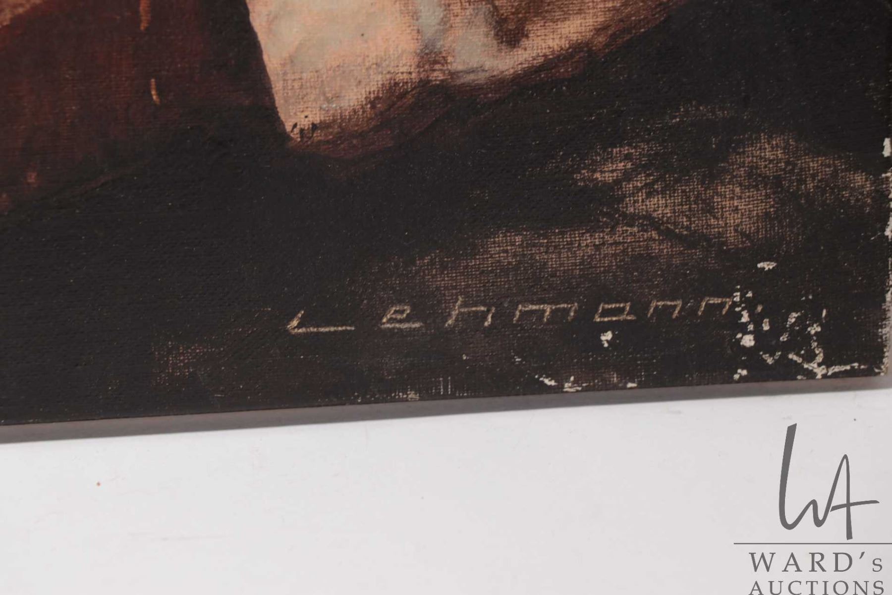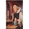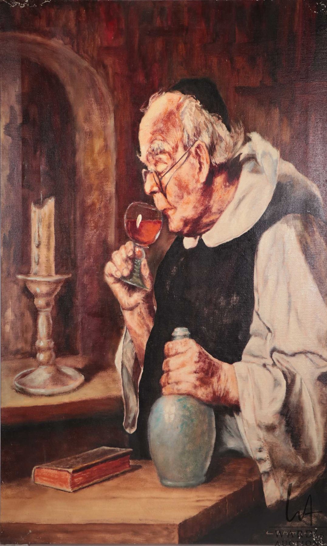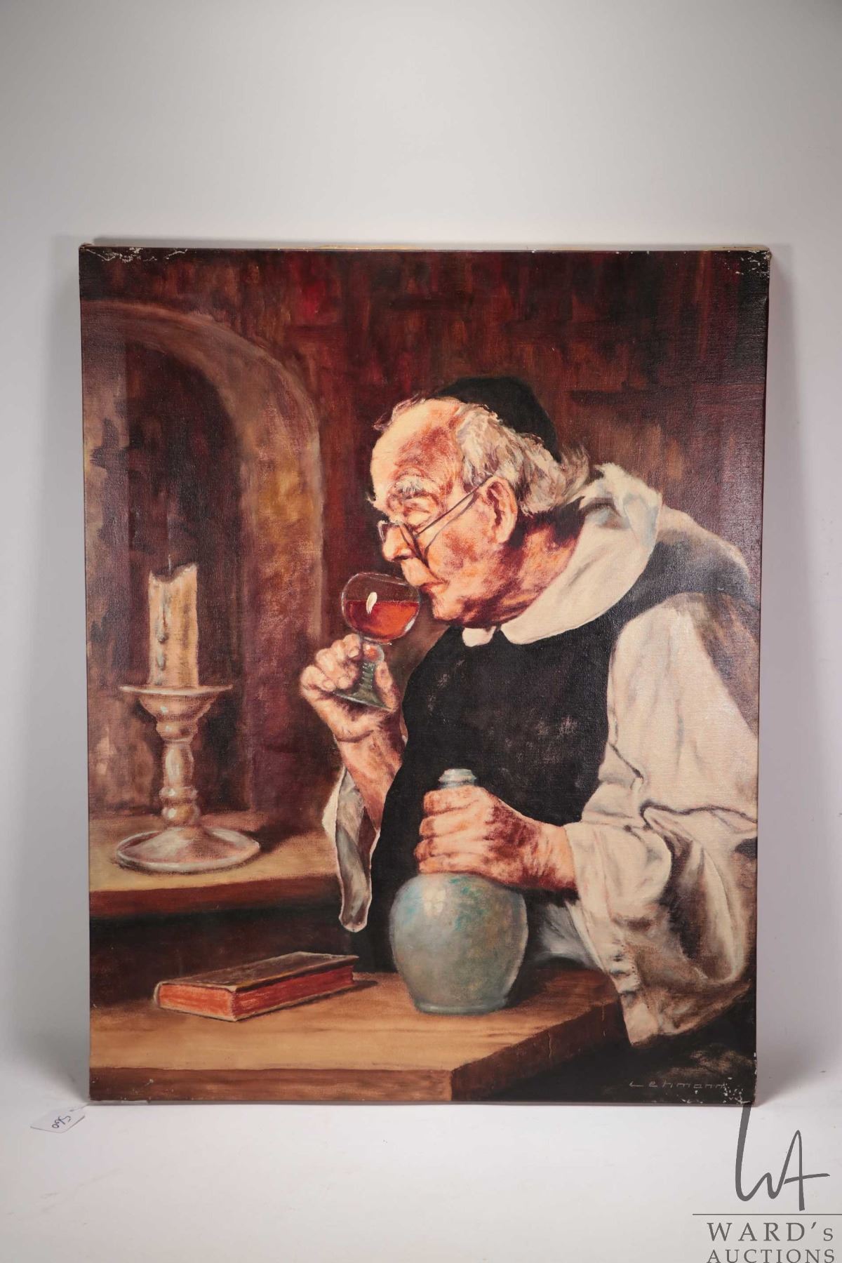 Stretcher framed oil on canvas painting of a friar sampling wine by artist Lehmann, 28" X 22"