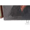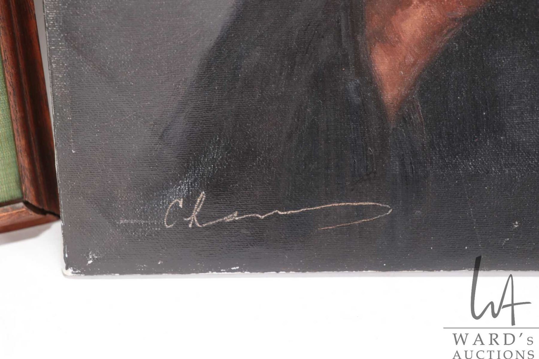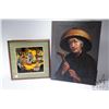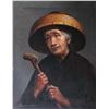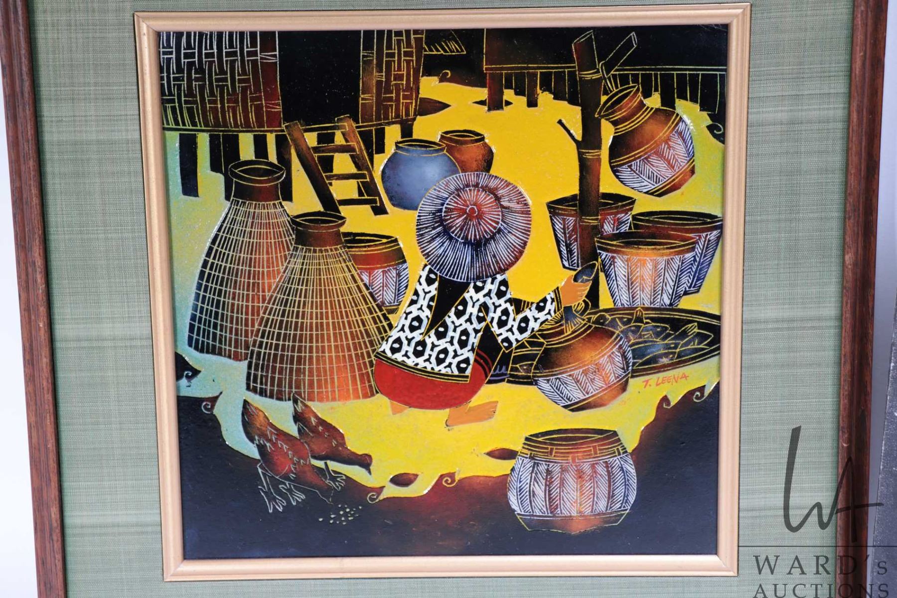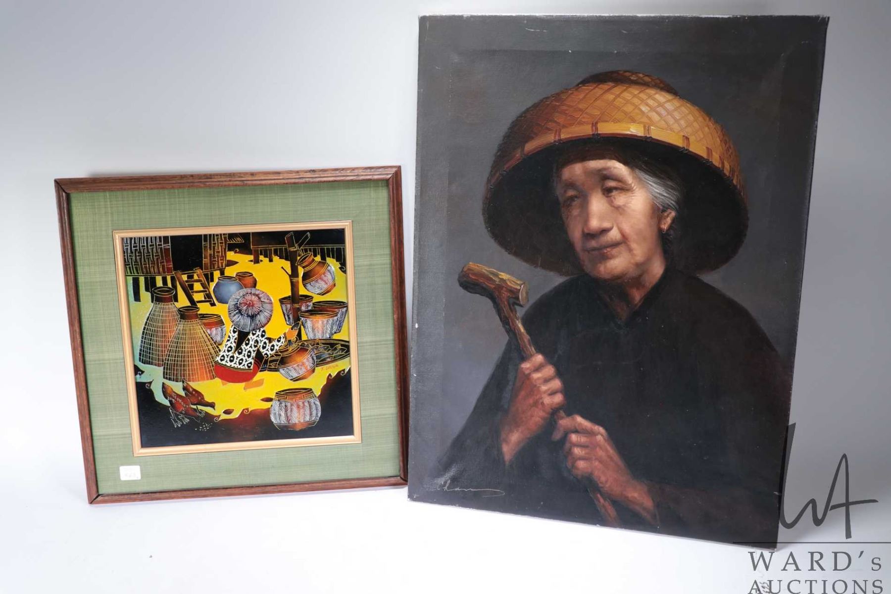 Stretcher framed oil on canvas portrait of an old woman, signed by artist Chan 24" X 18" and a framed acrylic on carved board painting of an Asian basket weavers, signed by artist T. Leena, 10 3/4" X 10 3/4"