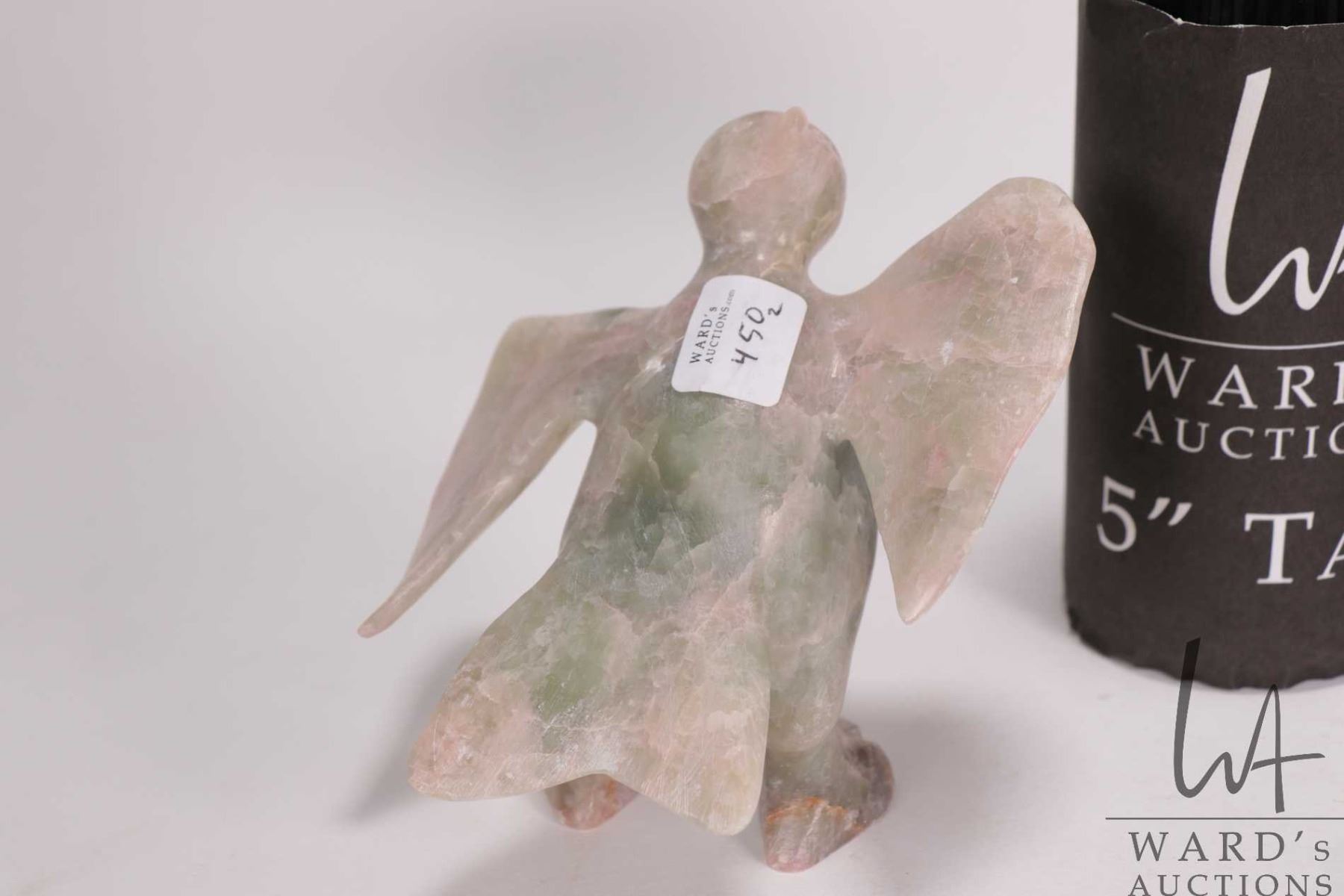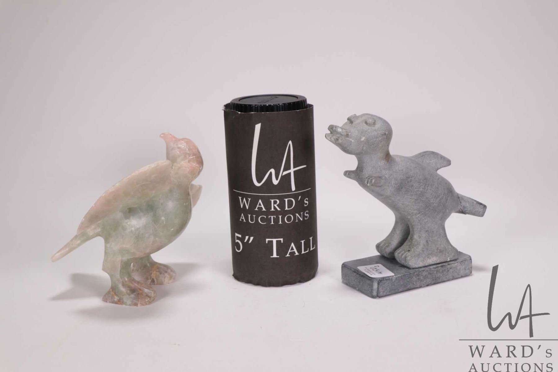 Stylized hand carved soapstone bird on base, 5 1/2" in height by artist A. Bersle and carved bird with out stretched wings, 4 3/4"