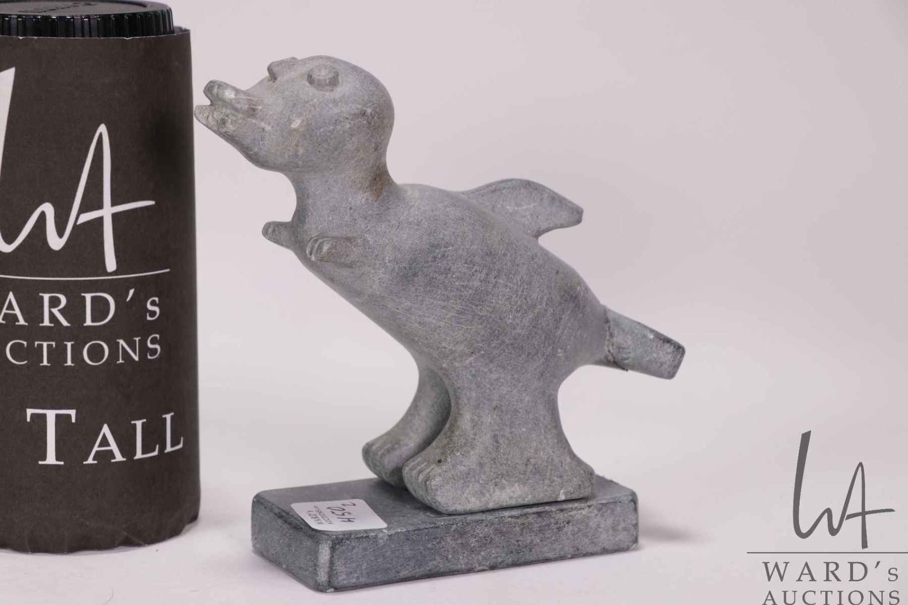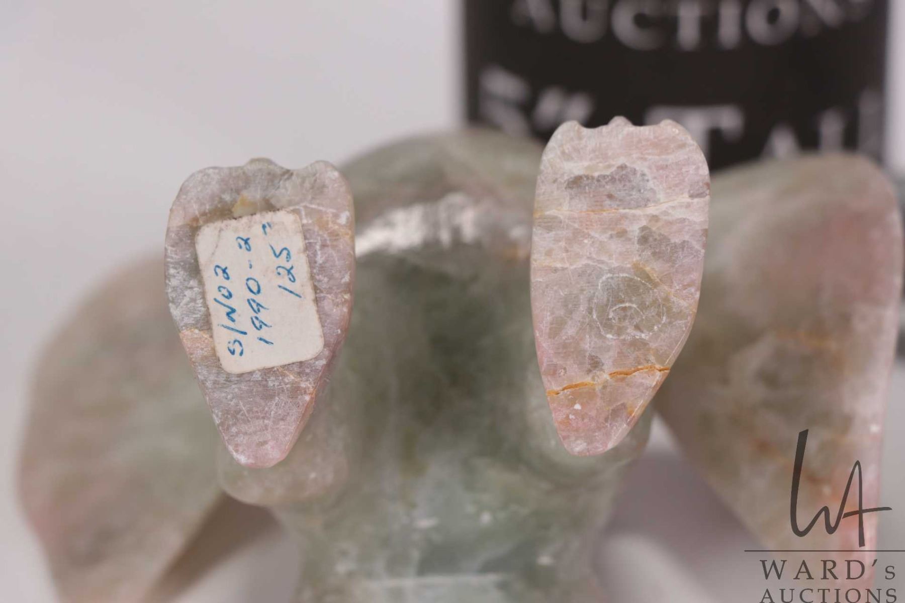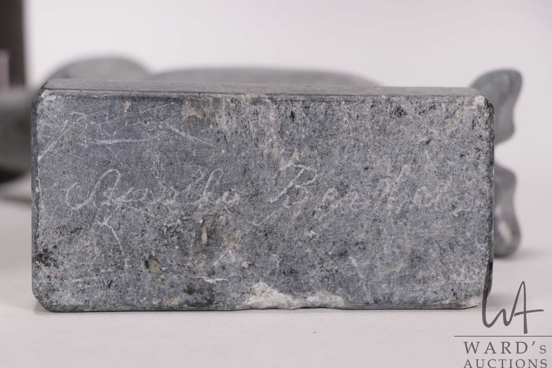 Stylized hand carved soapstone bird on base, 5 1/2" in height by artist A. Bersle and carved bird wi