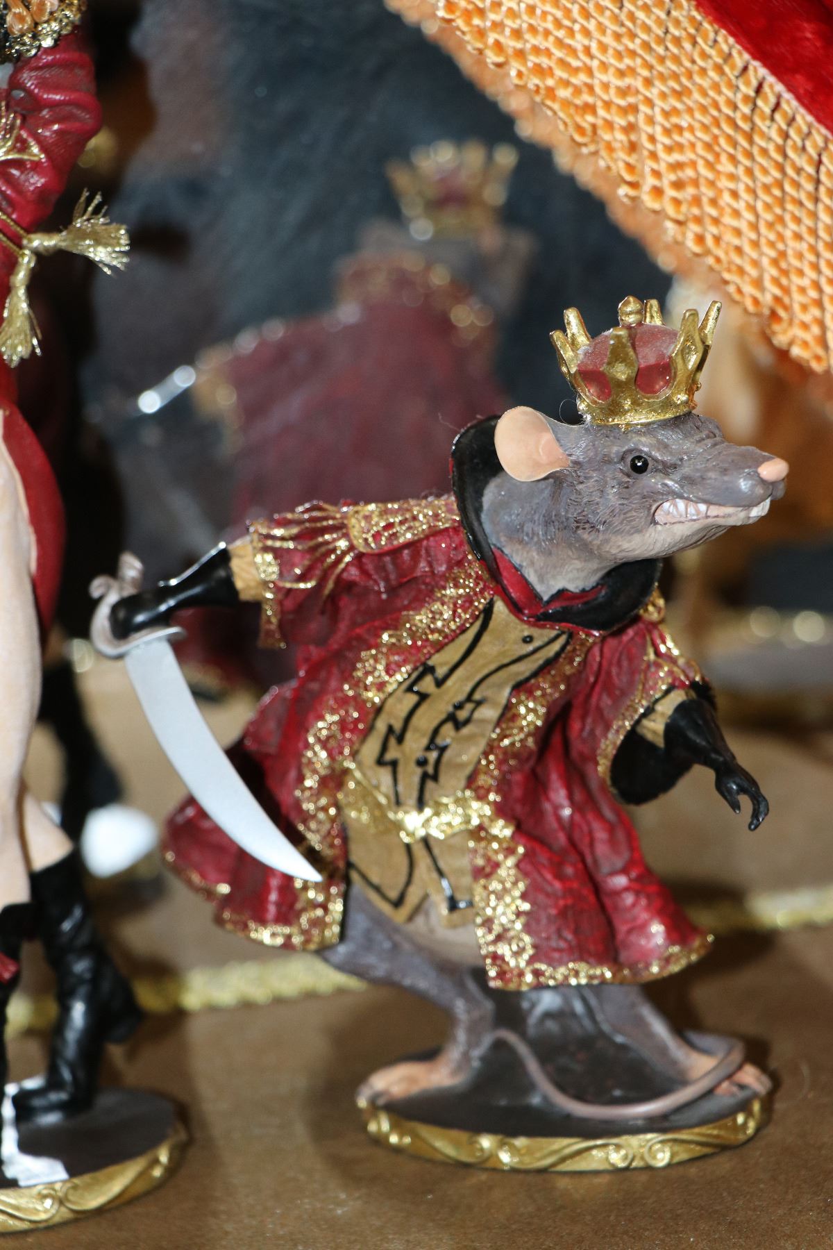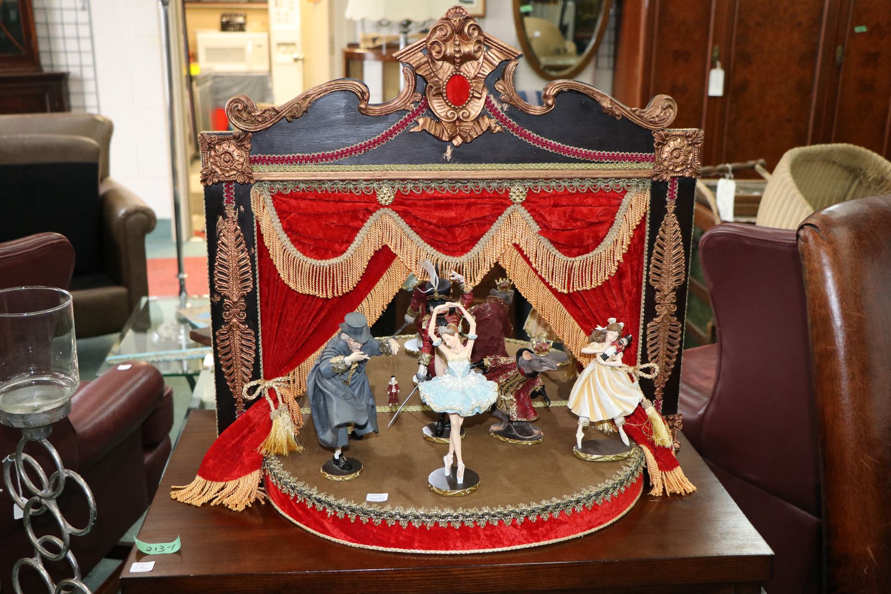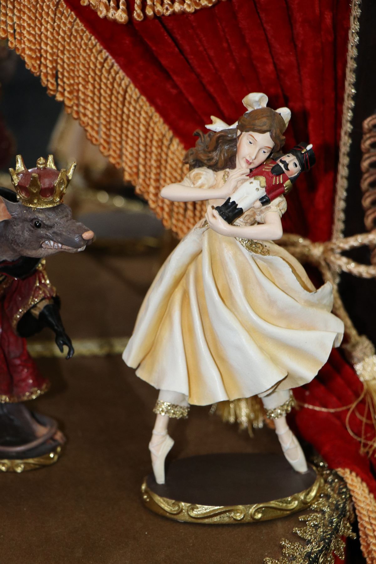 Sugar Plum fairy stage set with five resin characters including Clara, the Nutcracker Prince, the Mouse king, the Snow queen and Drosselmeyer, 25" high and 26" wide, note mouse has repair to sword