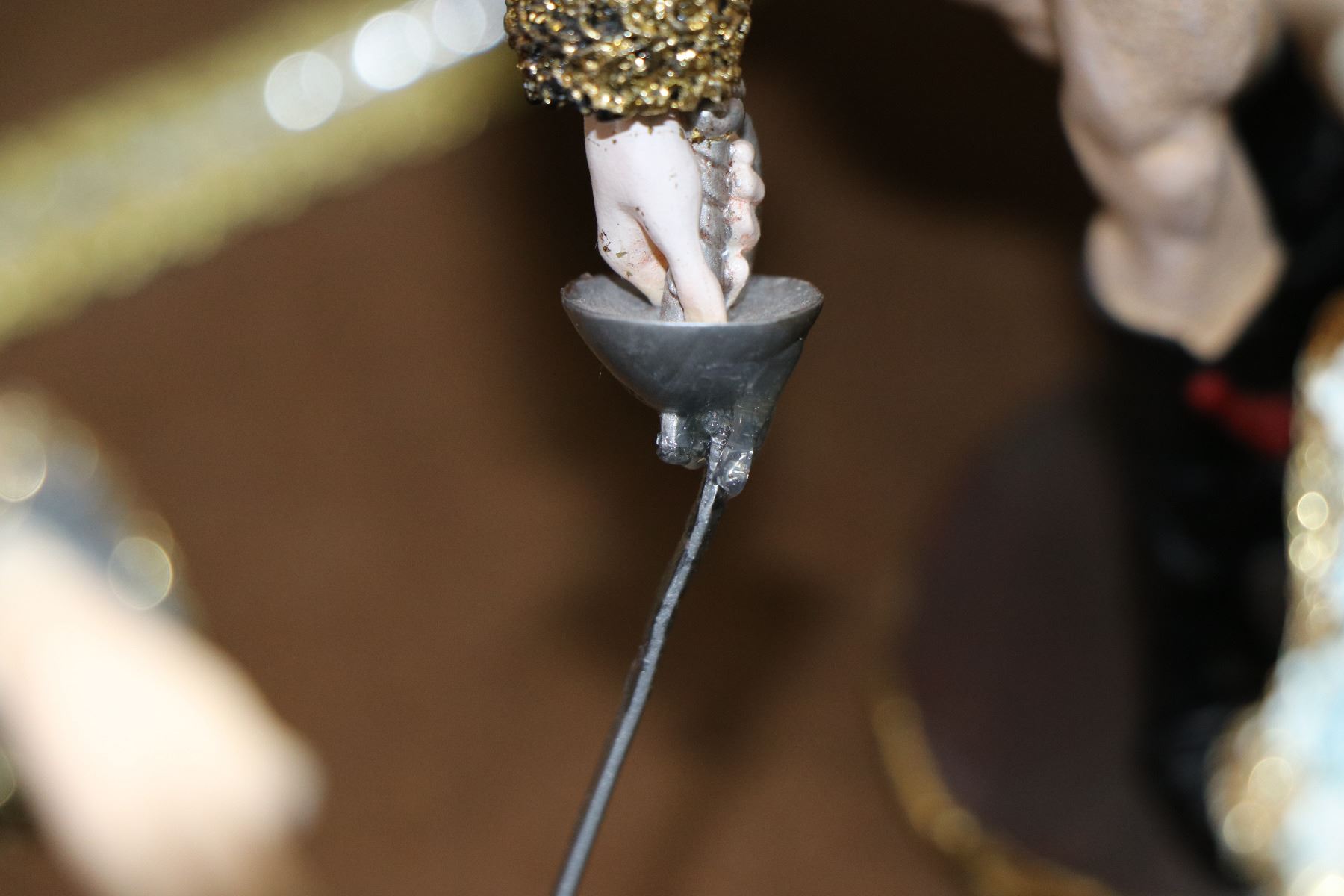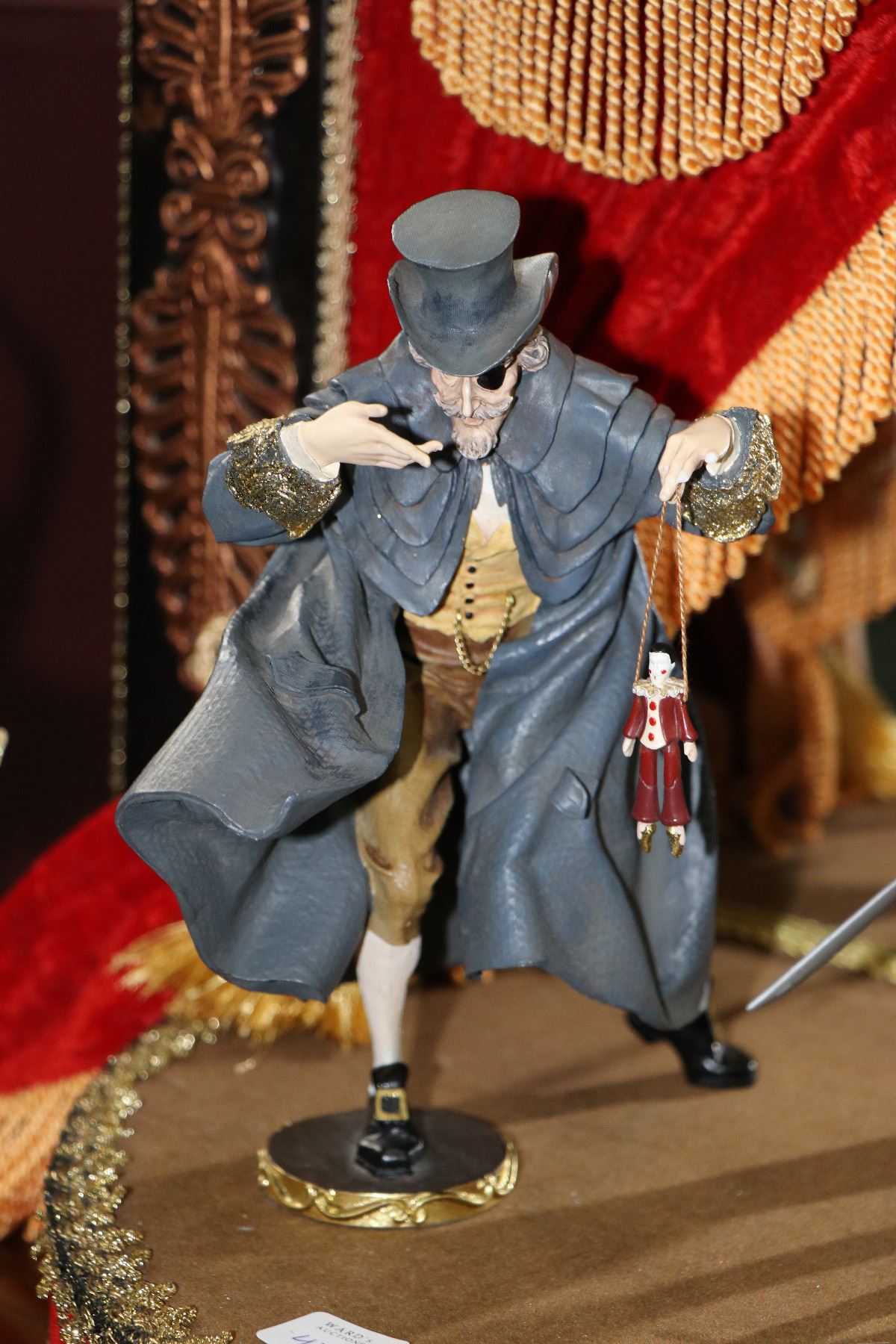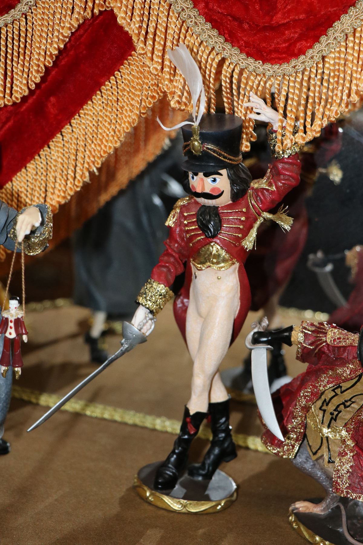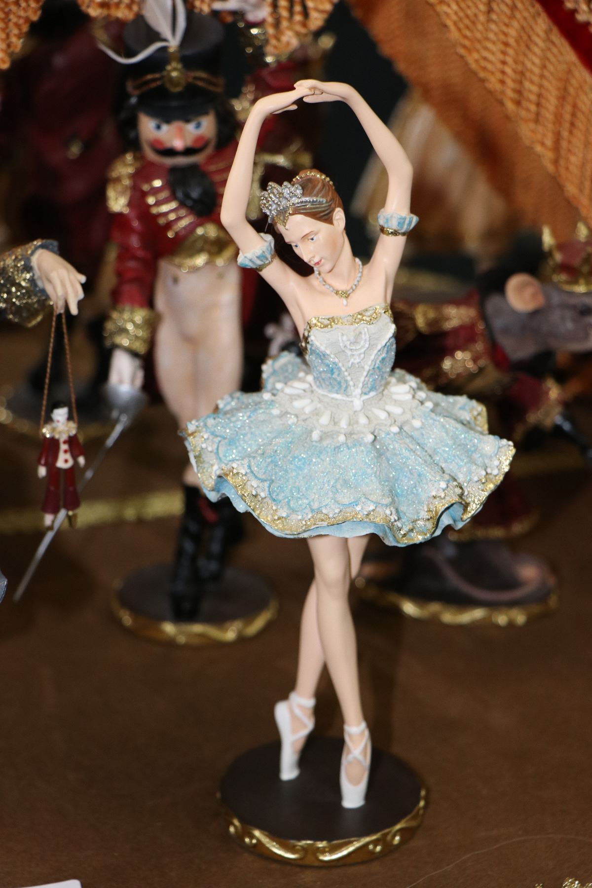 Sugar Plum fairy stage set with five resin characters including Clara, the Nutcracker Prince, the Mouse king, the Snow queen and Drosselmeyer, 25" high and 26" wide, note mouse has repair to sword