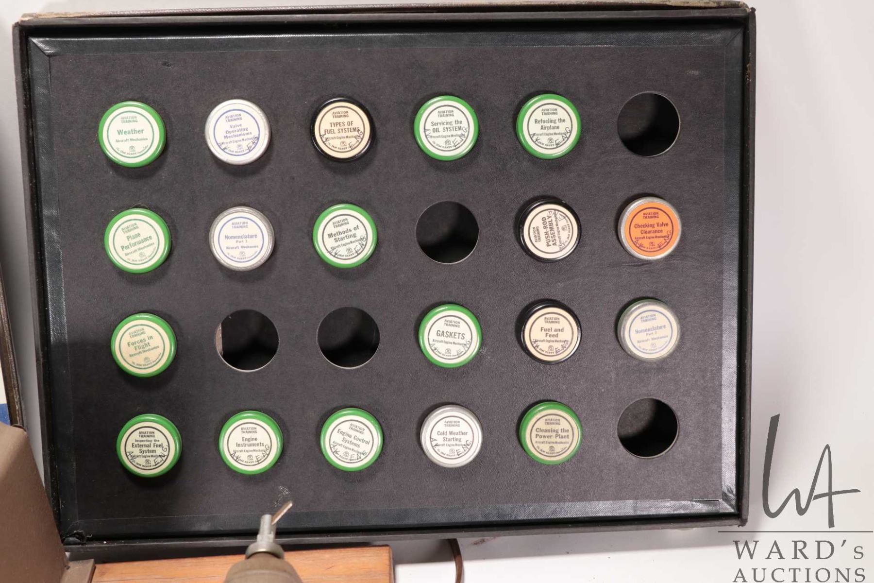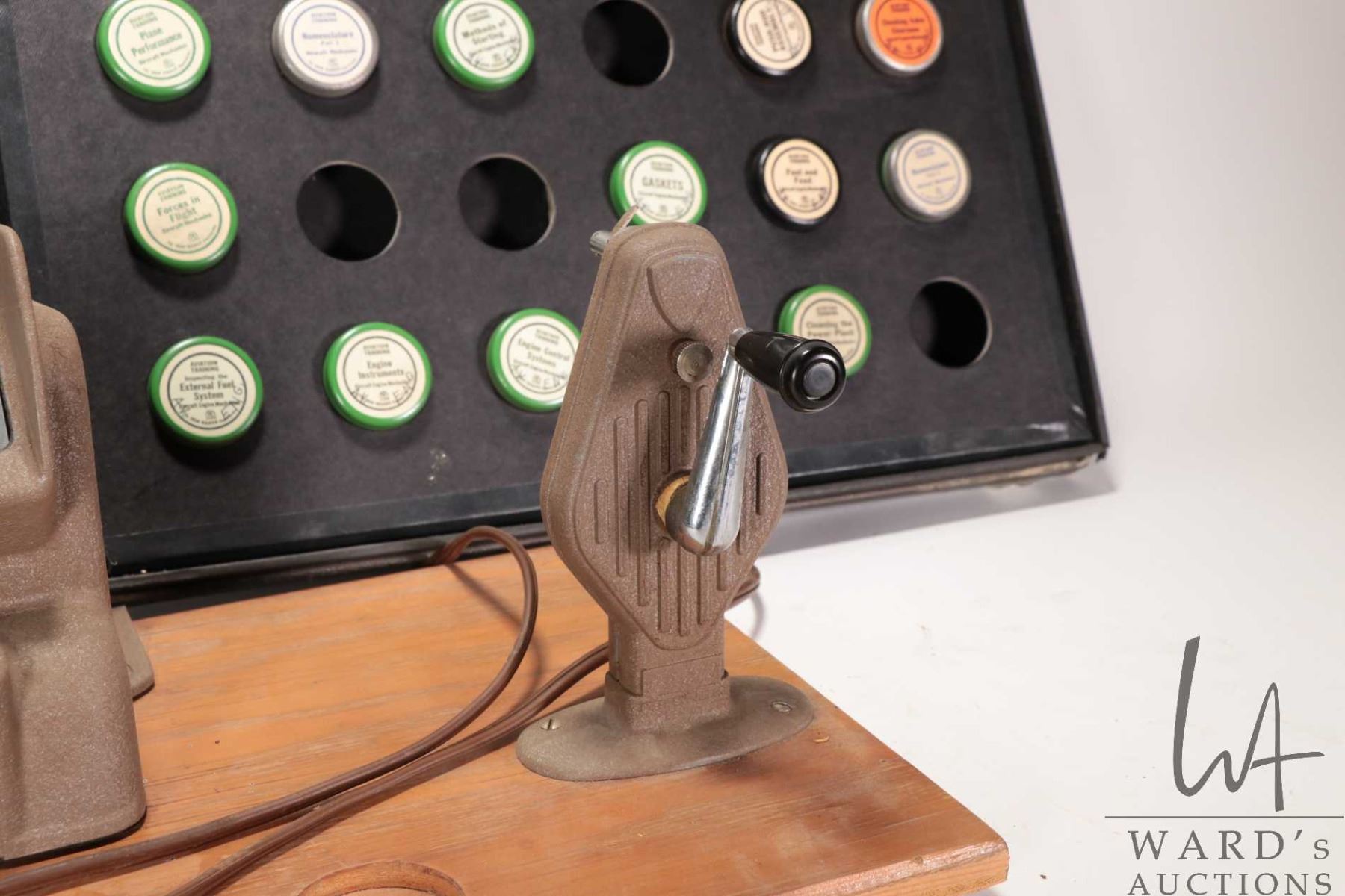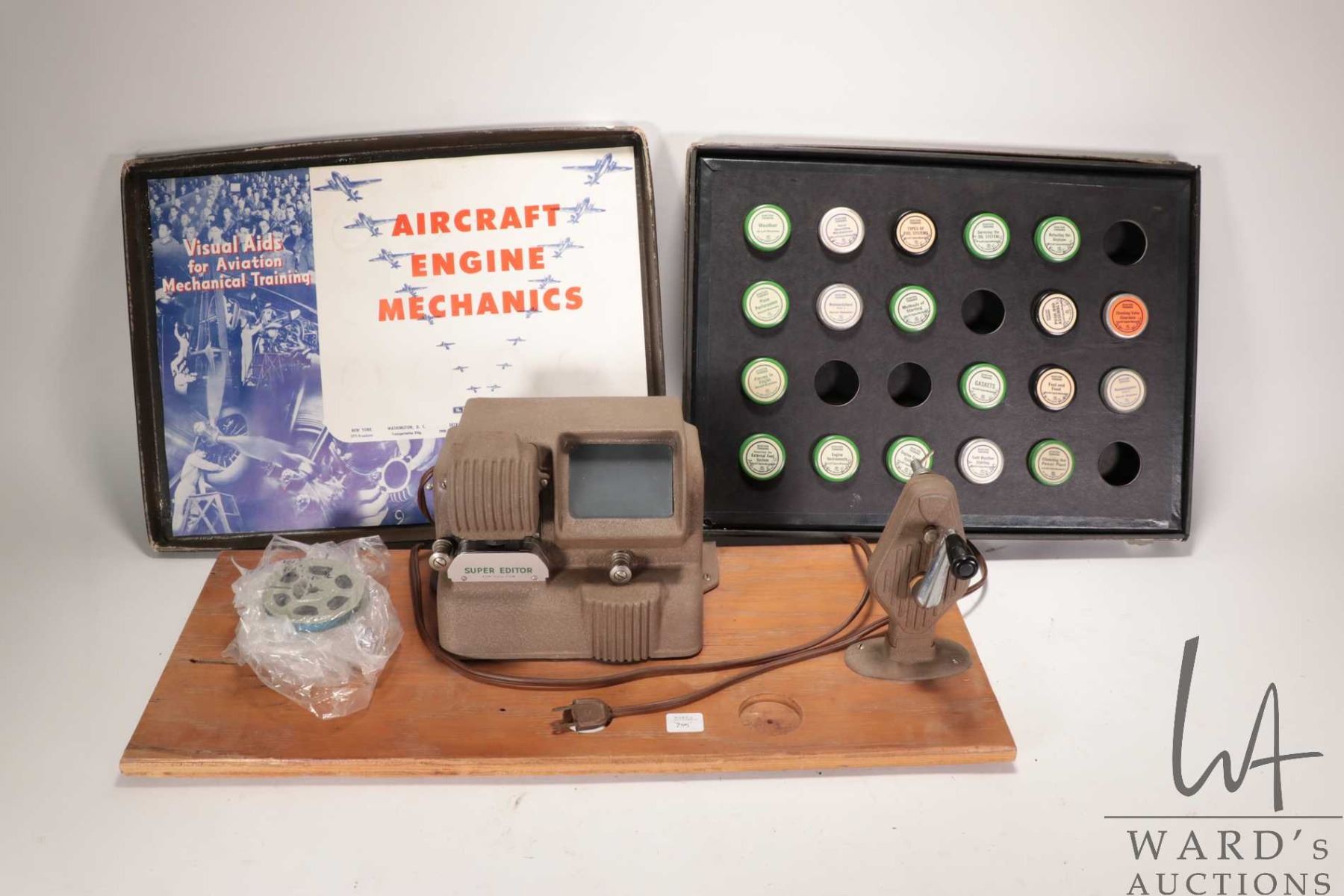 Super Editor 16mm film viewer and four spools of film, possibly tractor show footage and nineteen engine mechanics film strips