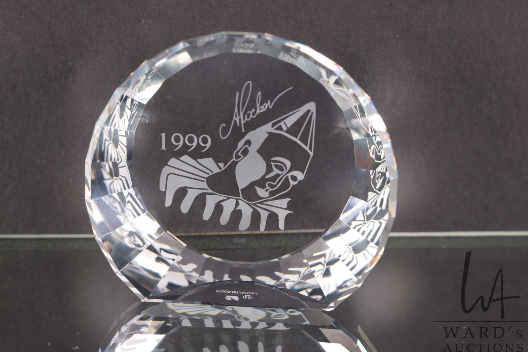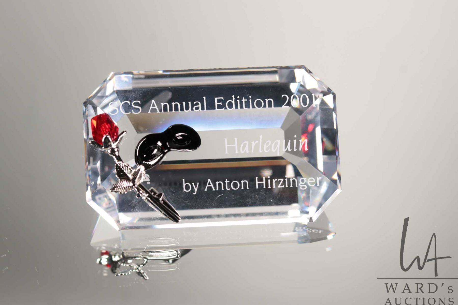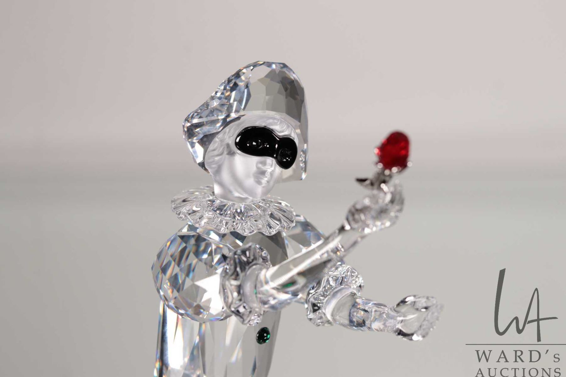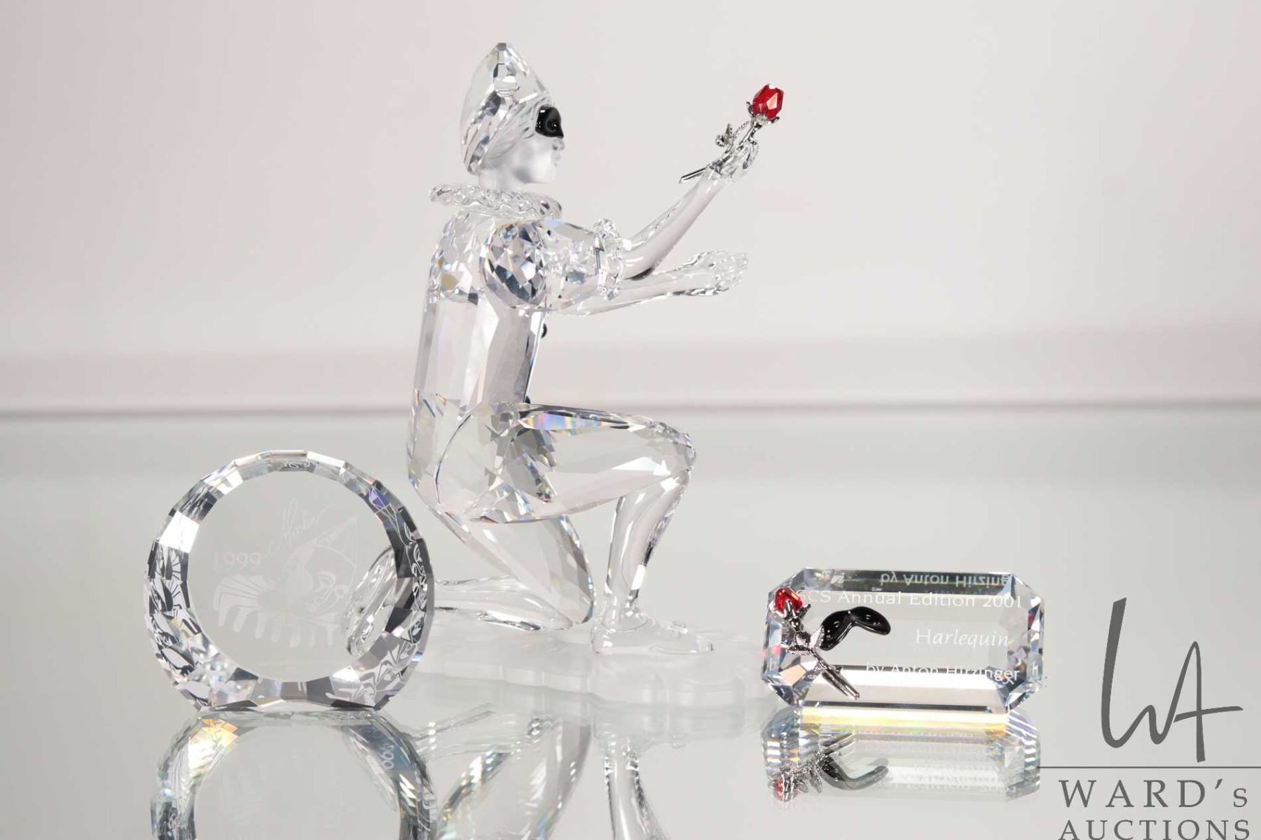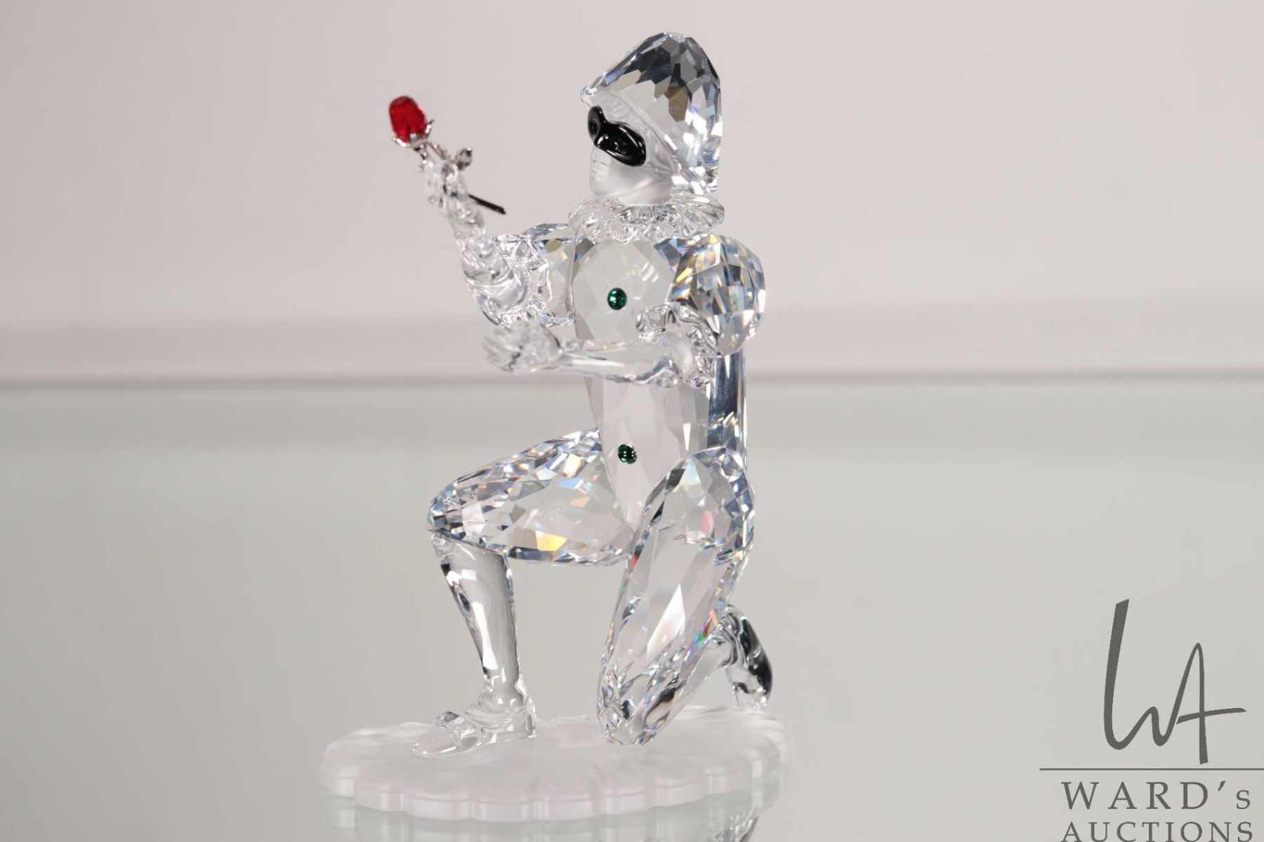 Swarovski crystal "Harlequin" no. 254044, 5 1/2" in height. From the 1999 Masquerade Trilogy. Includes figure and two crystal plaques plus original boxes