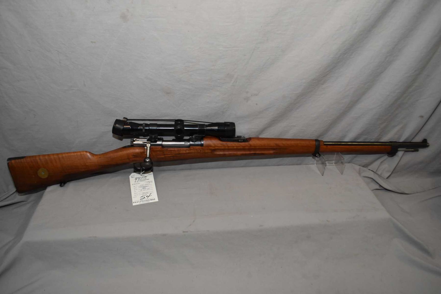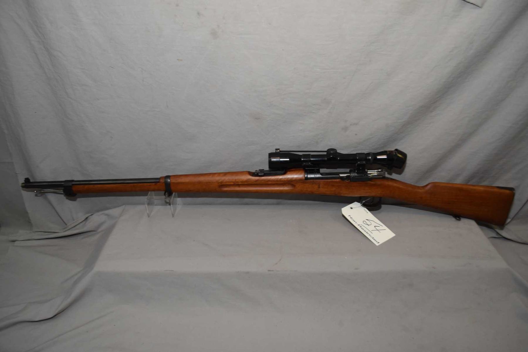Swedish Mauser ( Carl Gustaf ) Model 1896 6.5 x 55 Swedish Mauser Cal Bolt Action Full Wood Military Rifle w/ 29 1/2" bbl threaded at muzzle [ blued finish, barrel sights, matching numbered bolt, butt plate, mis-matched numbered foreplate, good wood, w/ sling swivels, c/w cleaning rod, note : also fitted w/ Tasco 4 x 32 scope, in Weaver rings and bases tapped in receiver ] Ser # 197985
