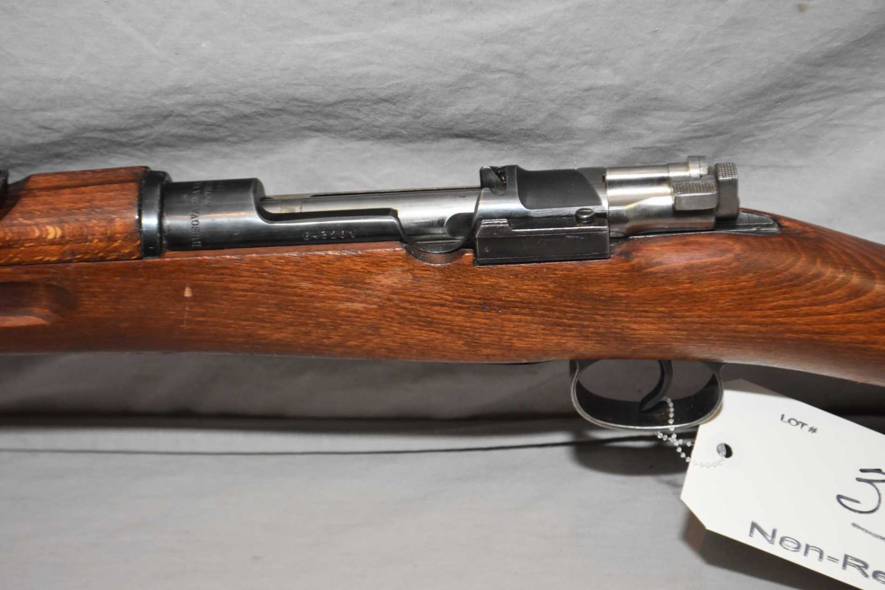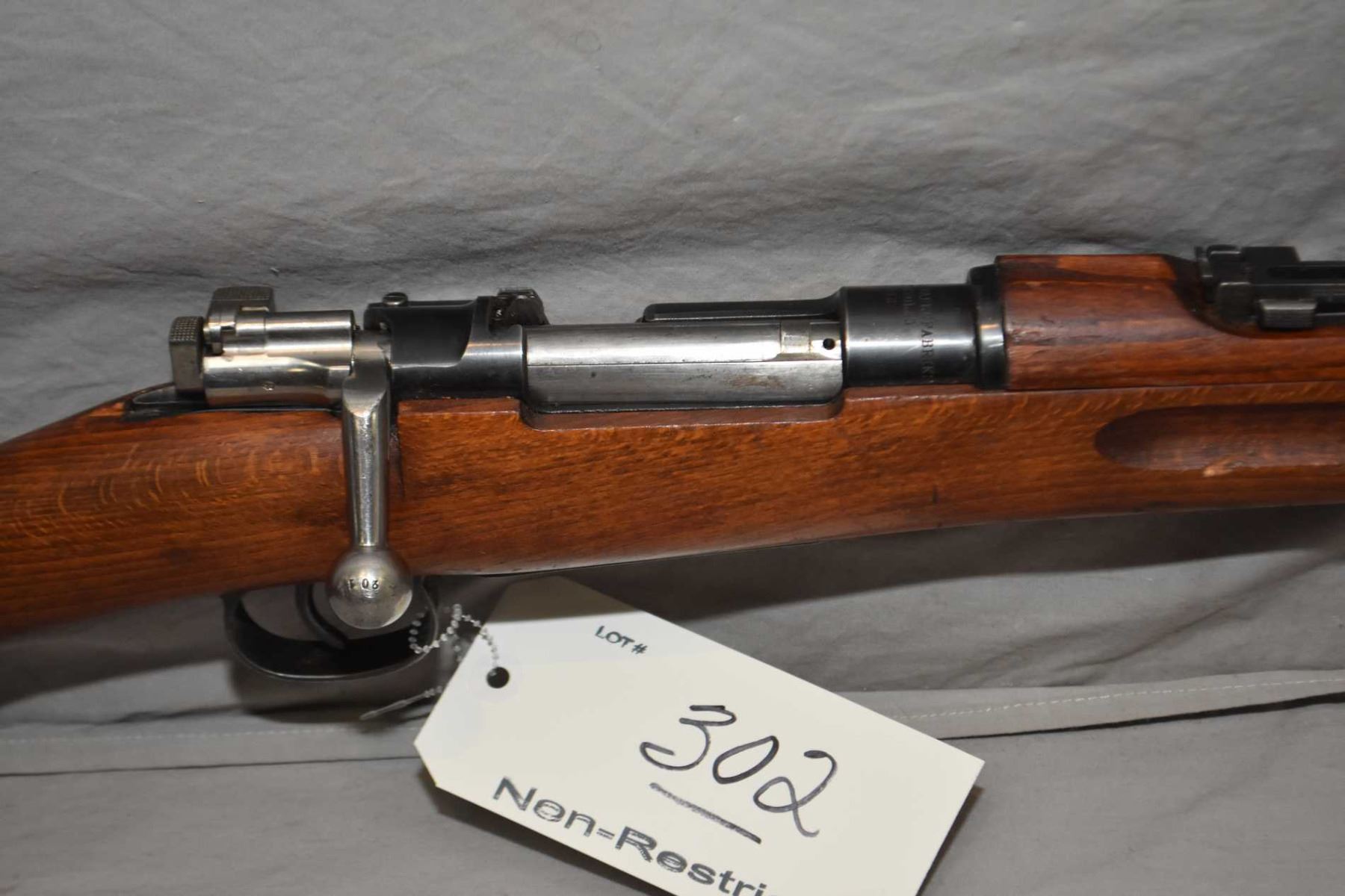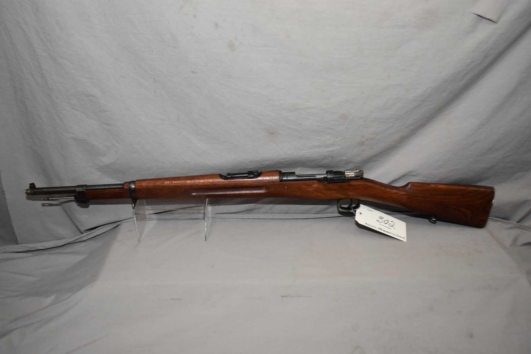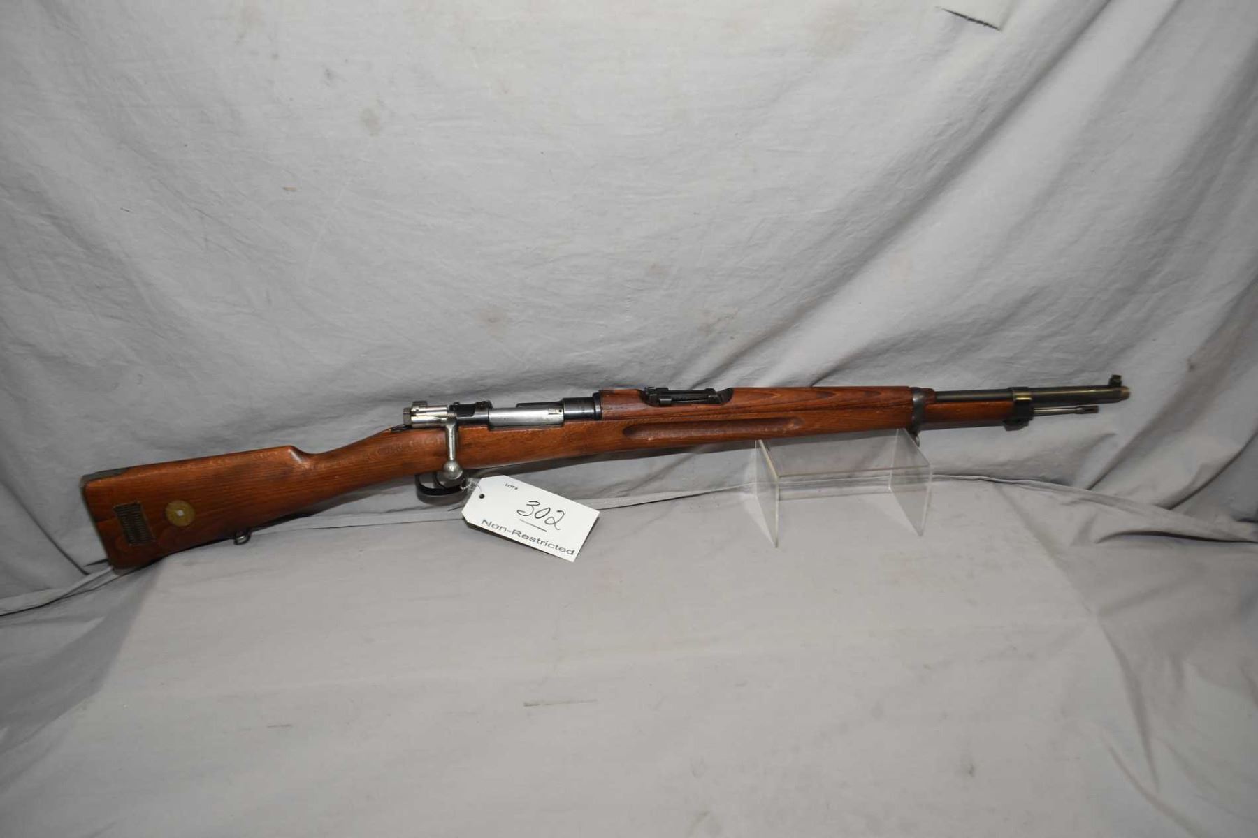 Swedish Mauser ( Husqvarna ) Model 1938 Short Rifle Dated 1942 6.5 x 55 Swedish Mauser Cal Full Wood Military Bolt Action Rifle w/ 24" bbl [ blued finish starting to fade, barrel sights, good wood with matching numbered bolt, brass plaque, sling swivels, c/w cleaning rod ] Ser # 643201