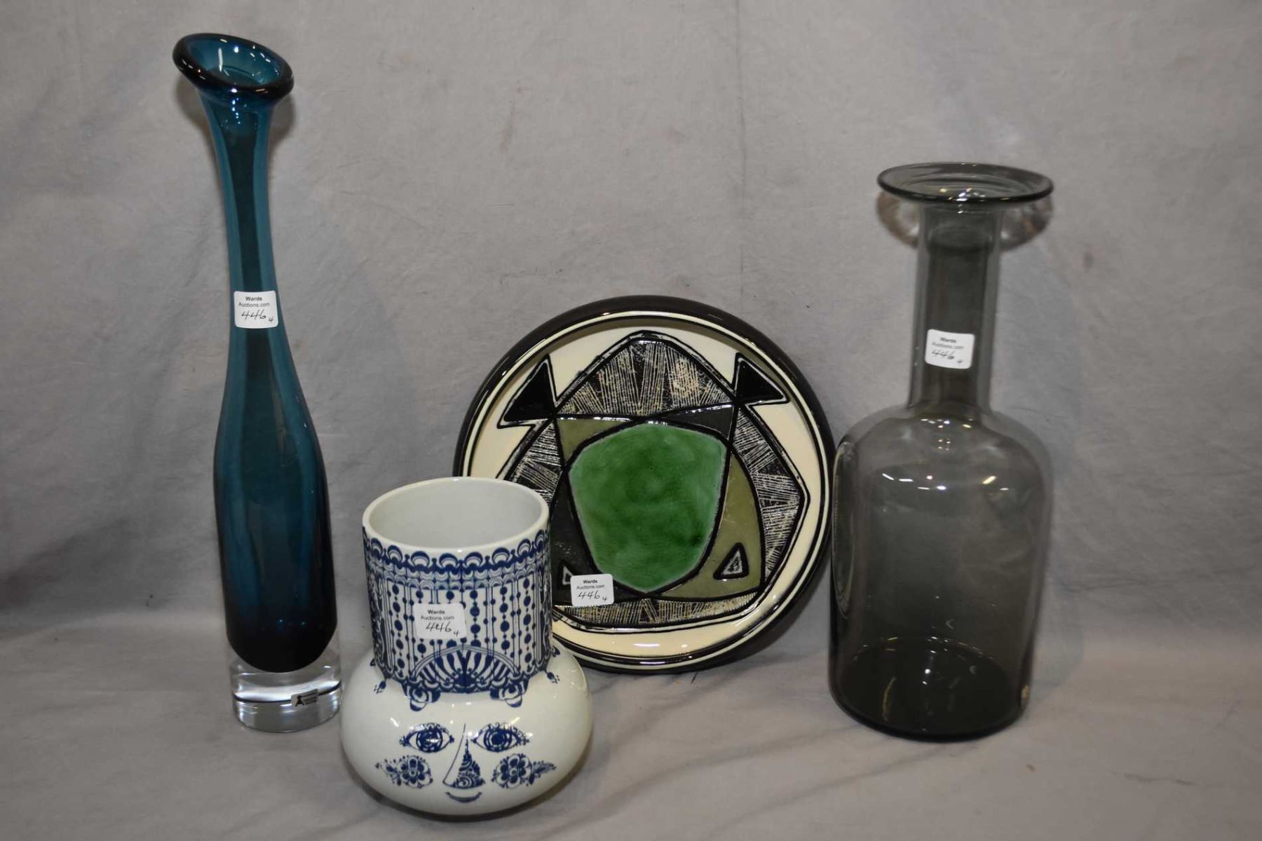 Swedish made Seda blue glass vase 15" in height, a Cascade Gull vase, Nymolle Denmark hand painted vase, and a Danish made glazed pottery dish