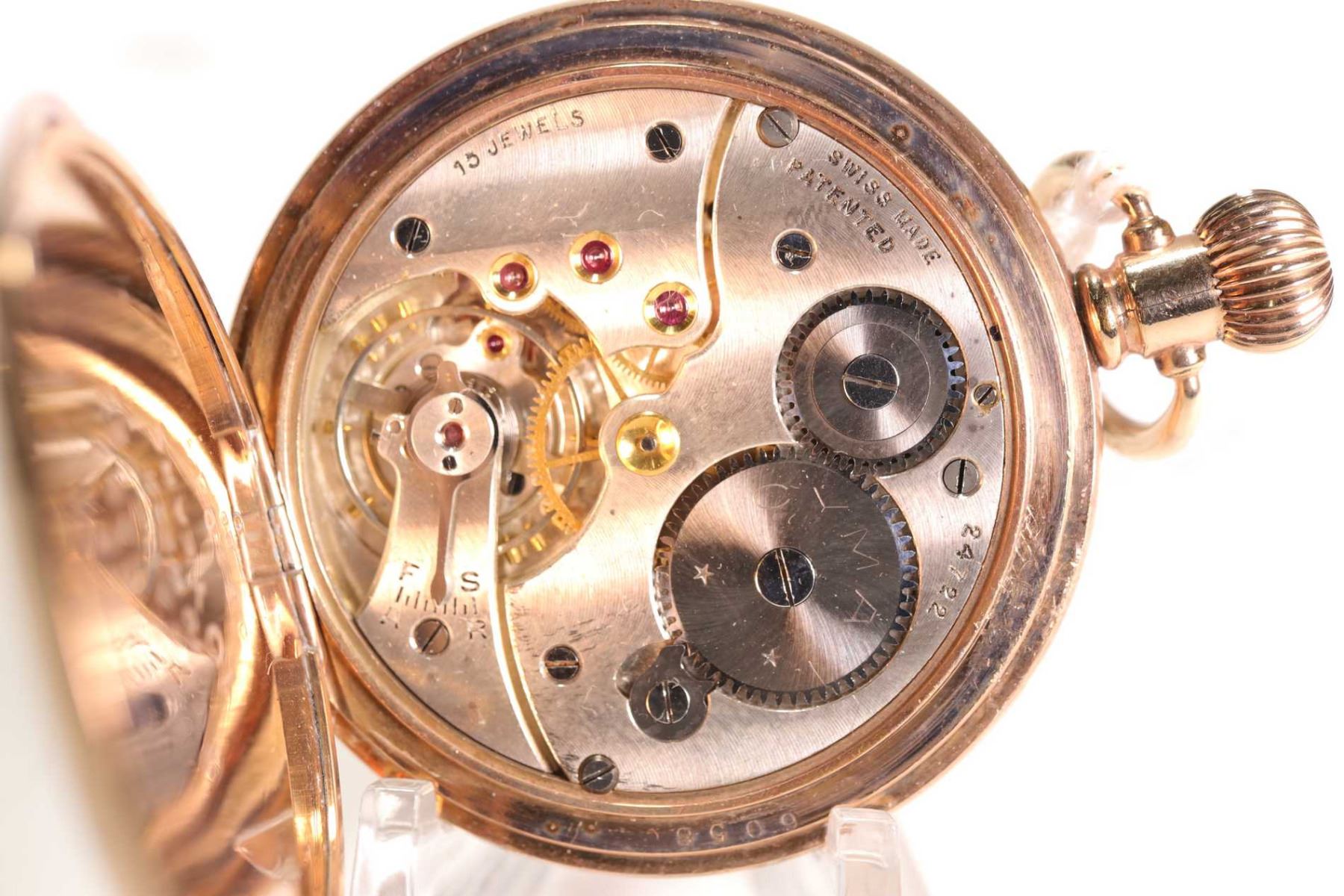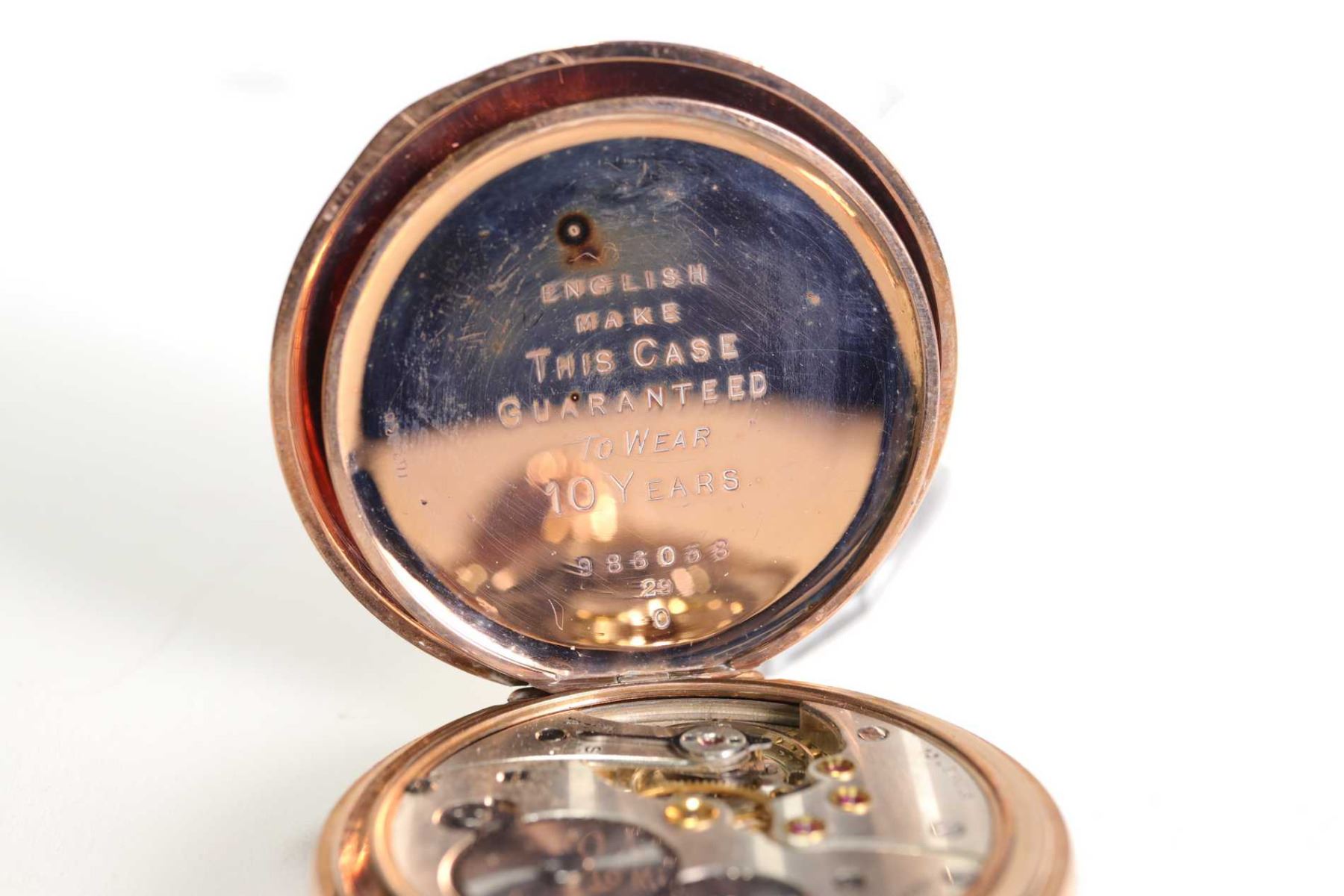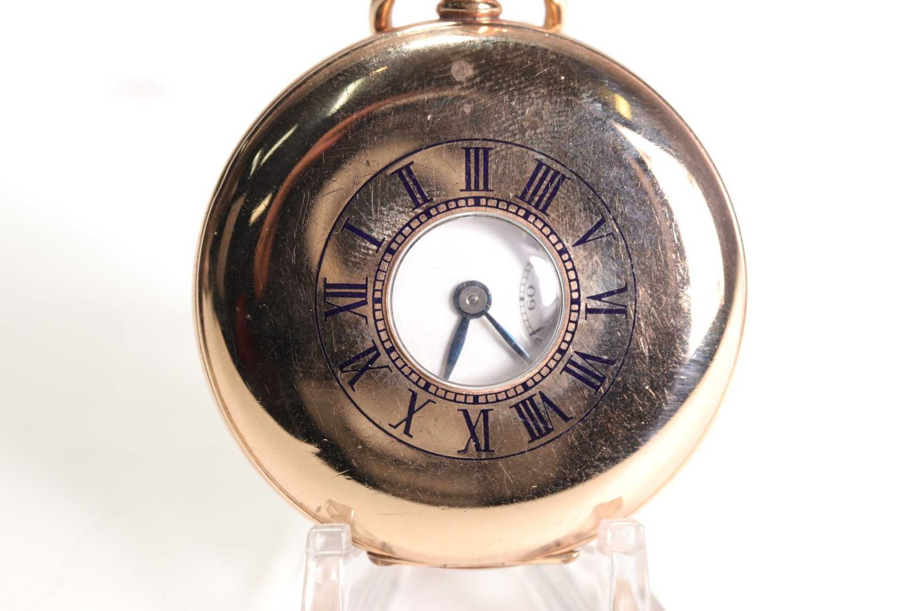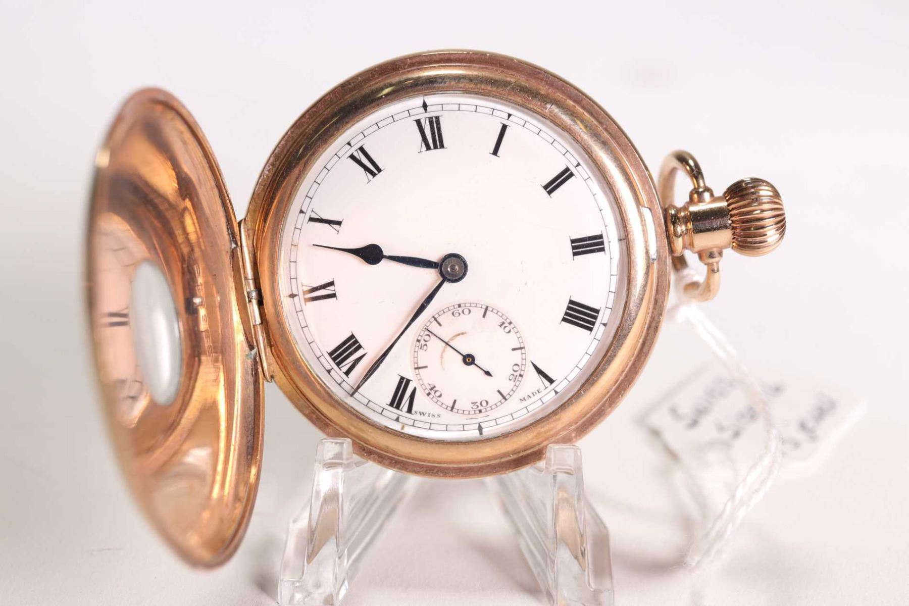 Swiss 1/2 hunter size 16, 15 jewel pocket watch. Patented serial no. 24722 dates this pocket watch to 1898. Split nickel plate stem wind and set movement signed Swiss made. This watch comes with a single sunk white porcelain dial with black Roman numerals and spade style hands. Housed in a Dennison Watch Case Co, gold filled bubble window case with Roman numerals on front cover. Working at time of cataloguing