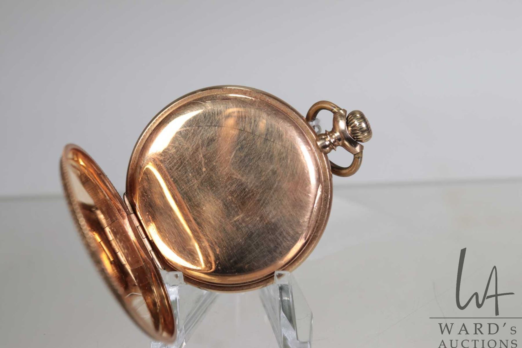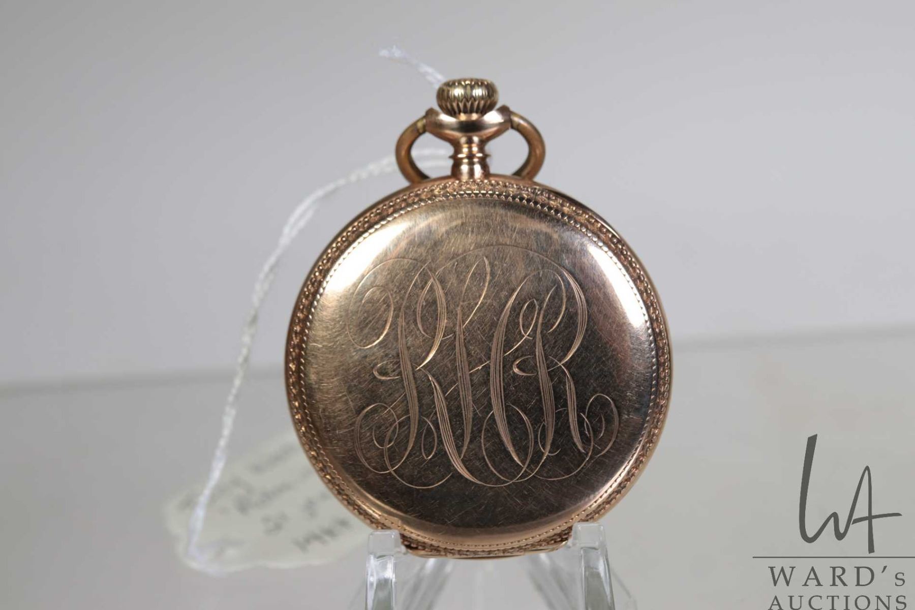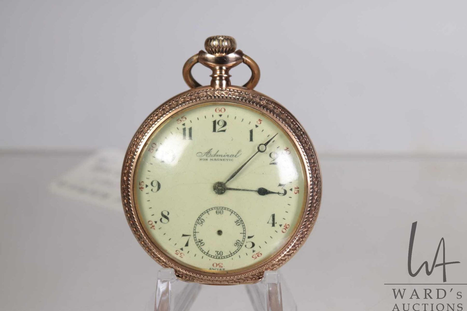 Tacy Watch Co. Admiral pocket watch, 21 jewel, size 12, four adjustment pocket watch with white single sunk dial and second sweep. Note: missing hands on sweep. 14kt yellow gold A.W.C. Co. open face case. Working at time of cataloguing