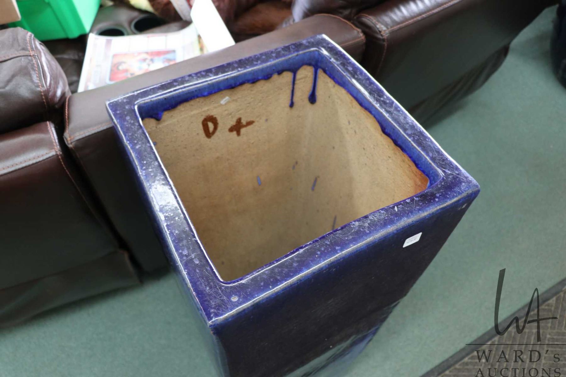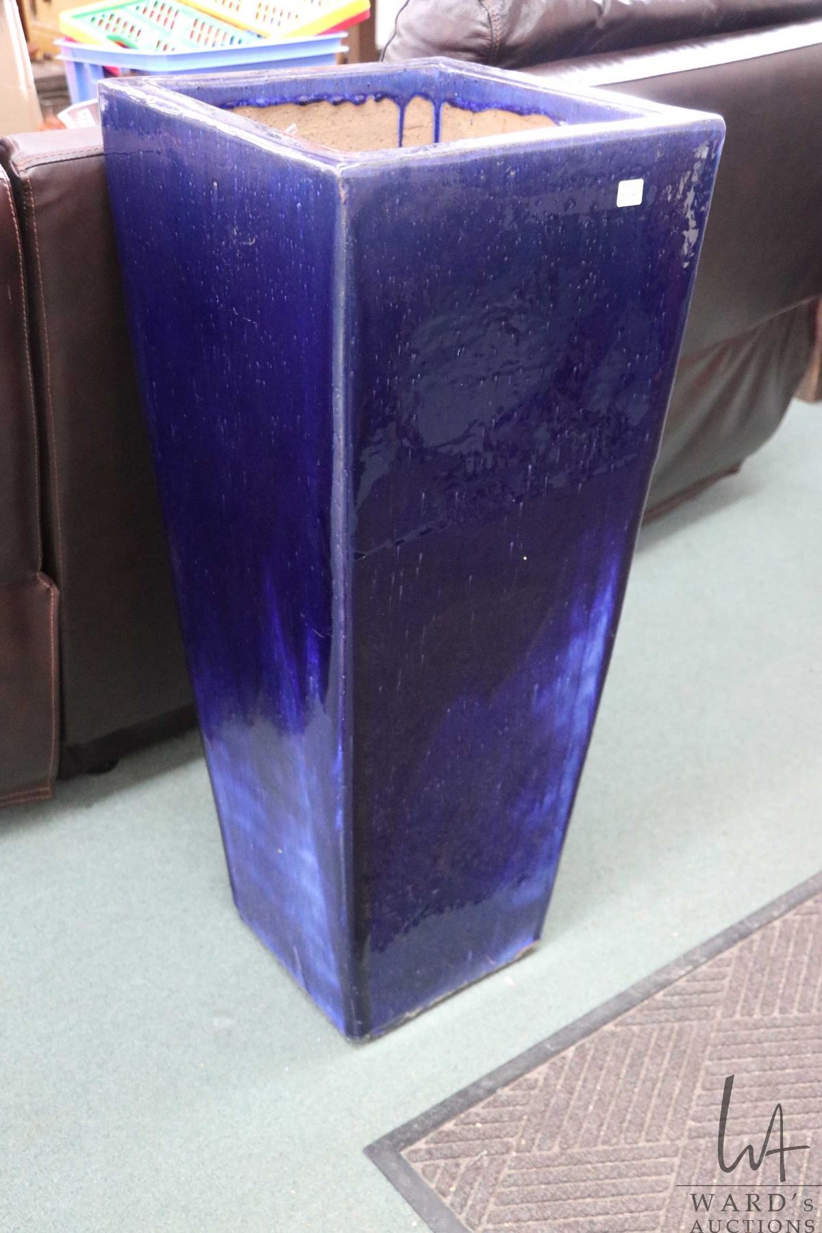 Tall blue glazed planter, 36" H X 15" square