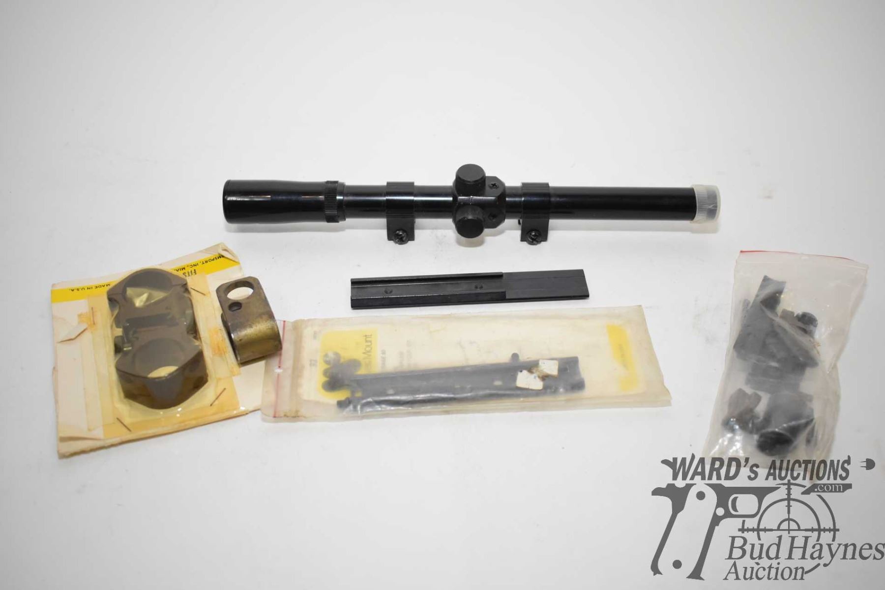 Tasco 4 x1.5 scope, assorted mounts and rings, bag Tasco 4 x1.5 scope, assorted mounts and rings, bag w/ assorted vintage sights, etc
