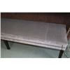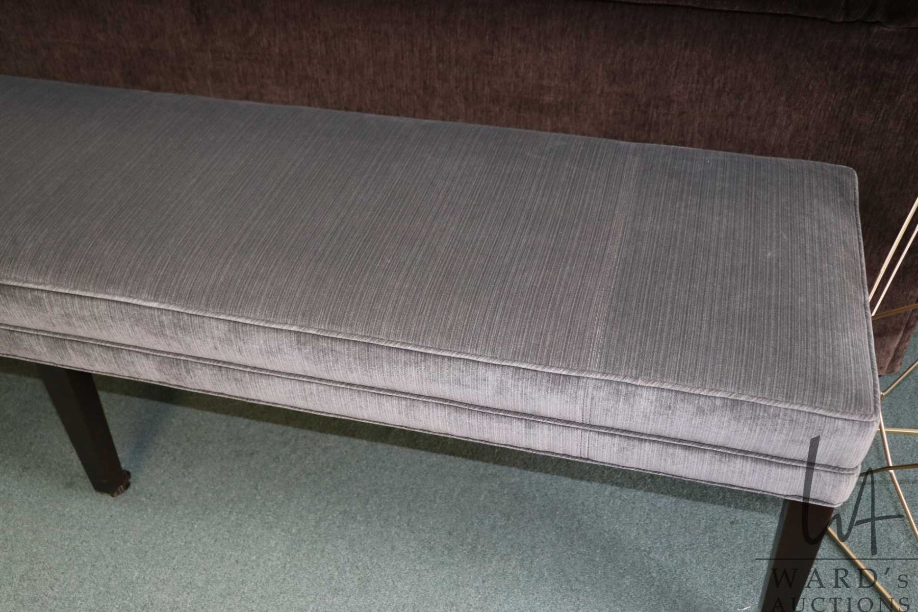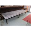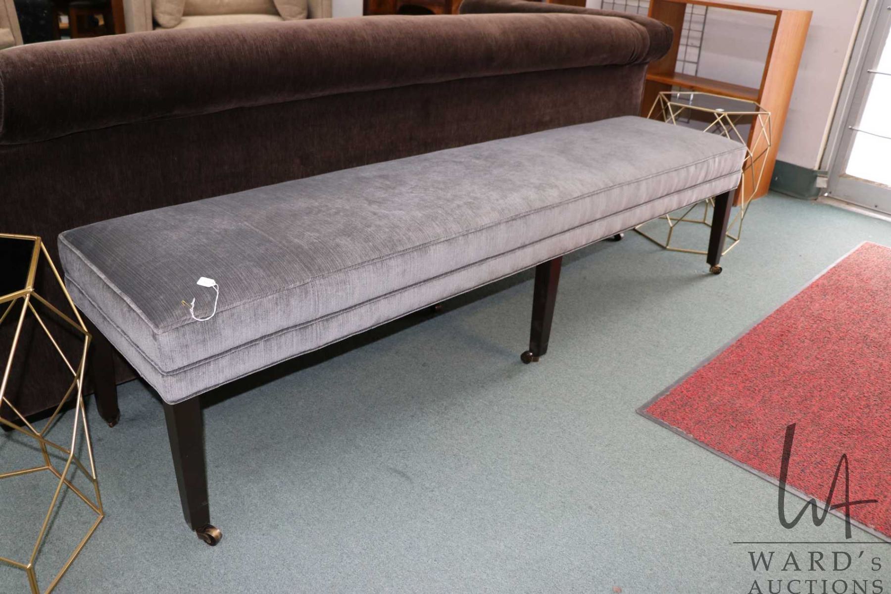 Taylor King upholstered bench with tapered supports and brass castors, 19" H X 75" W X 18" D