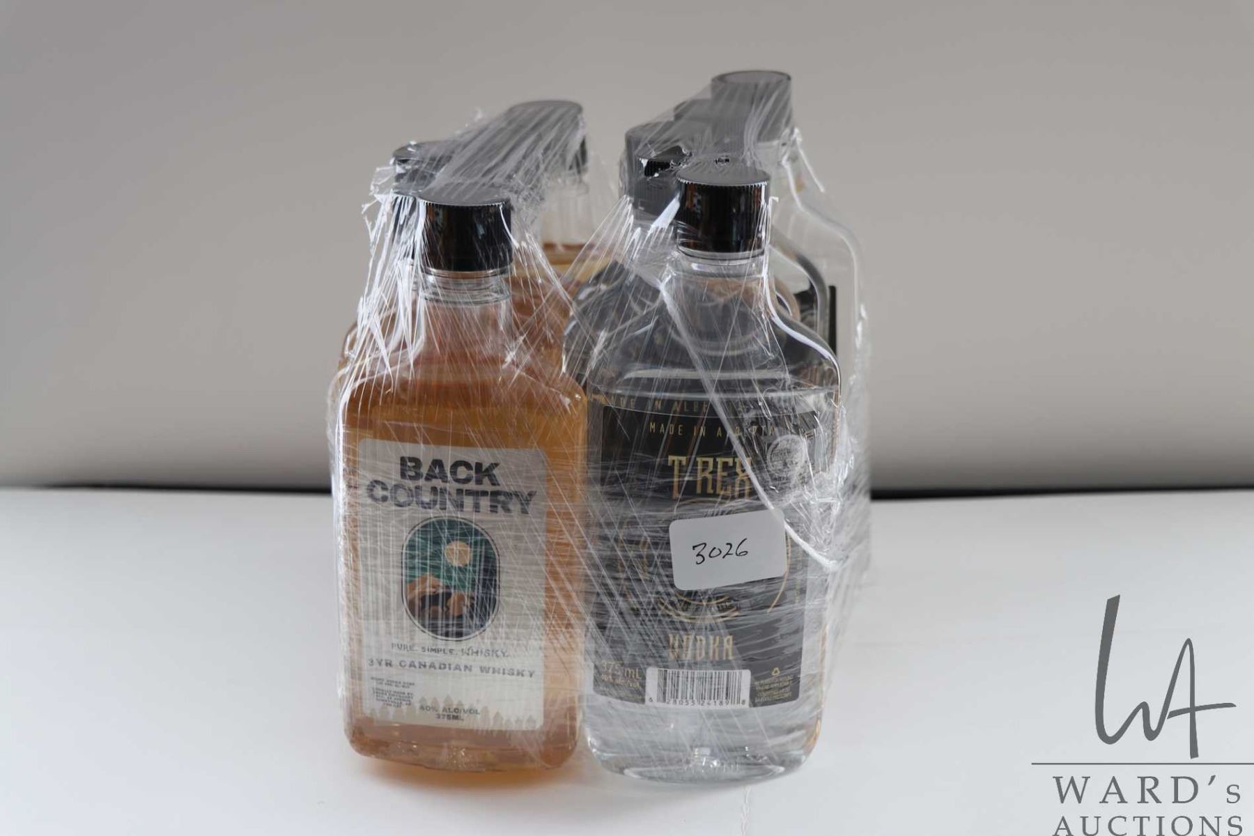 Ten 375ml bottles including 5 Back Country 3 year Canadian Whiskey / 40% ABV and 5 T Rex Vodka / 40% ABV Note: Alcohol cannot be insured by any courier in Canada. Local pick up is recommended. Canadian bidders only
