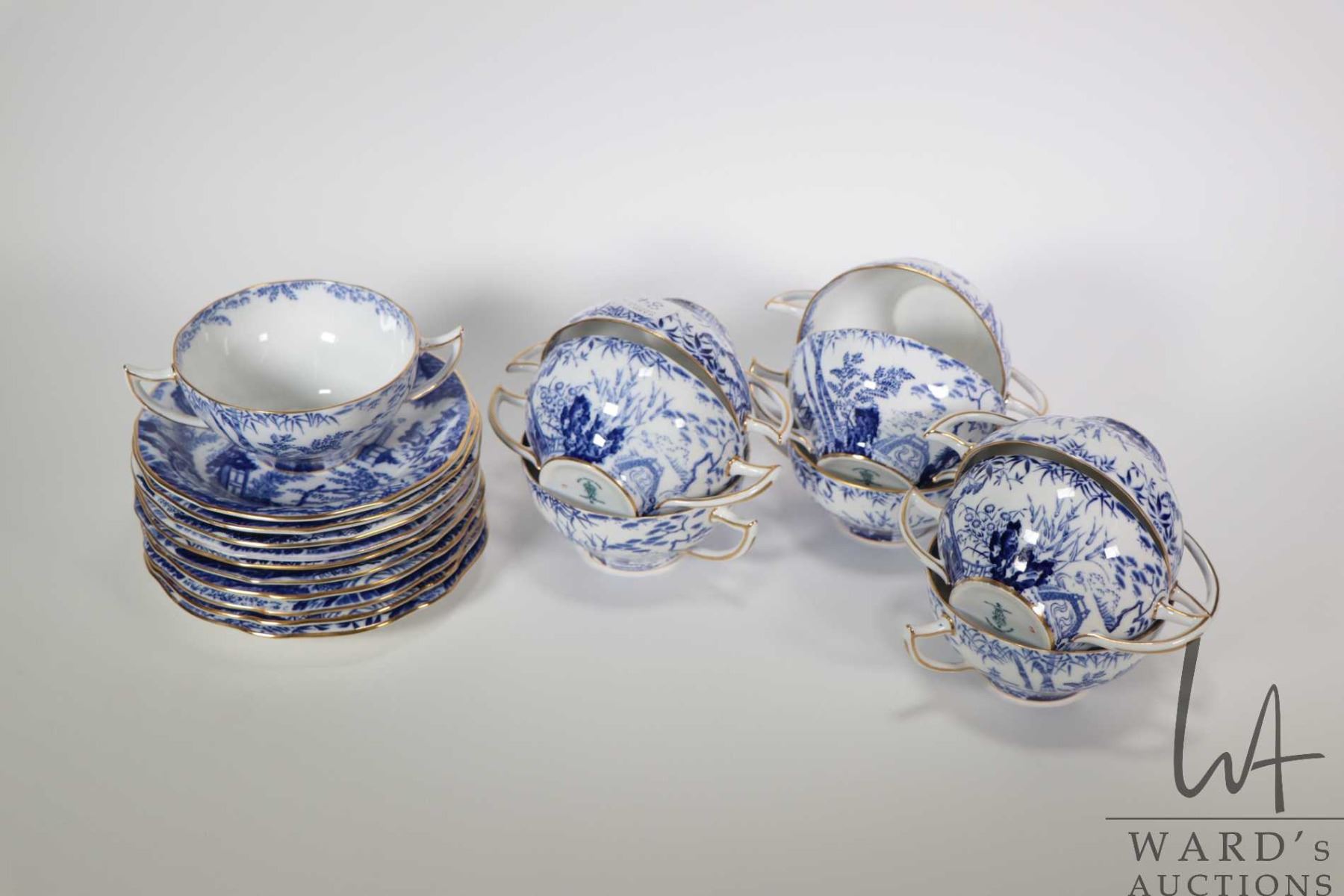 Ten Royal Crown Derby "Mikado" bouillon bowls and drip trays. Note: Not available for shipping. Local pickup only