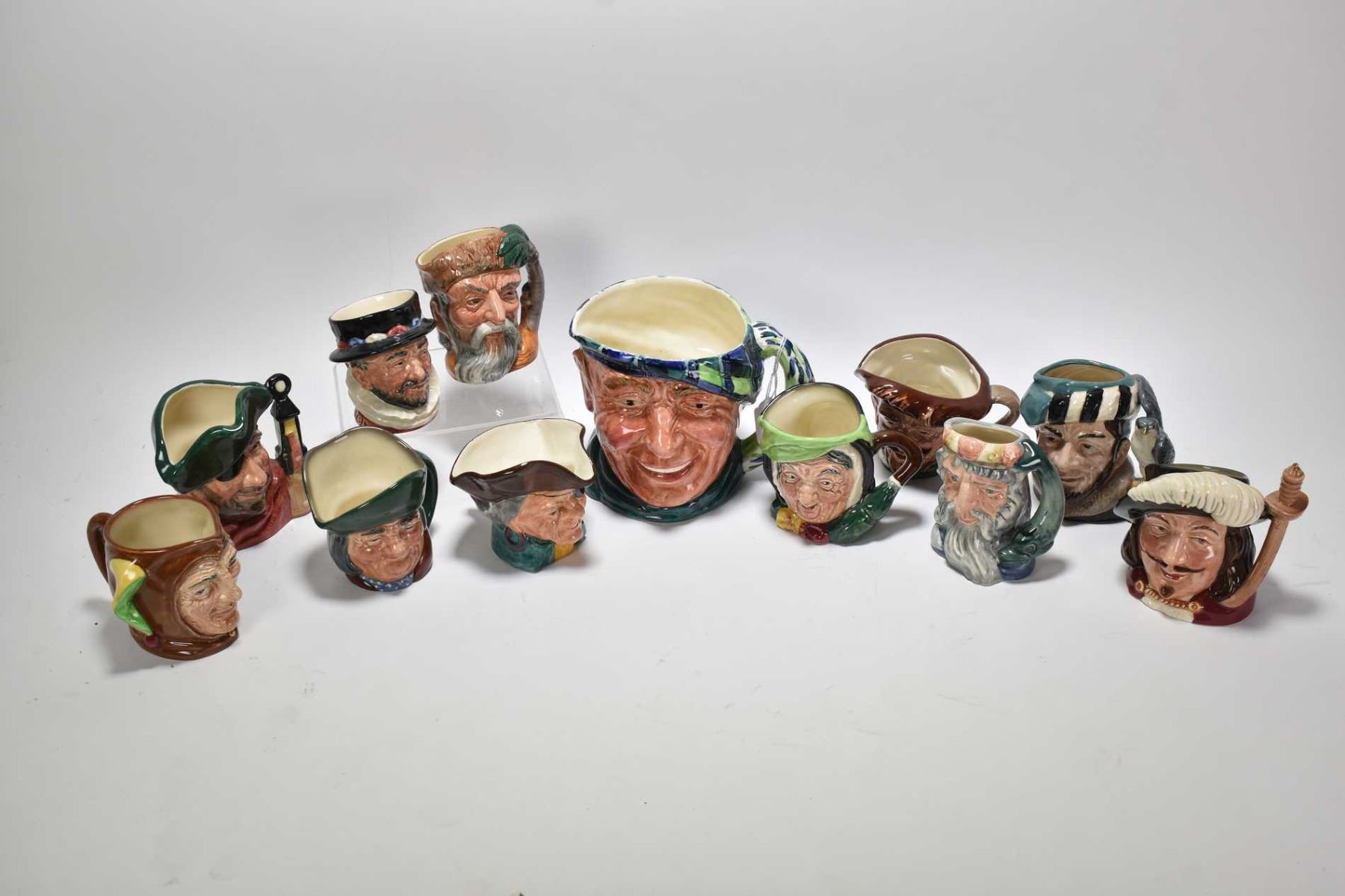Ten Royal Doulton medium sized character jugs including Robinson Crusoe, Drake etc. plus Sterling Captain Patch and a large Hanley Tam O' Shanter