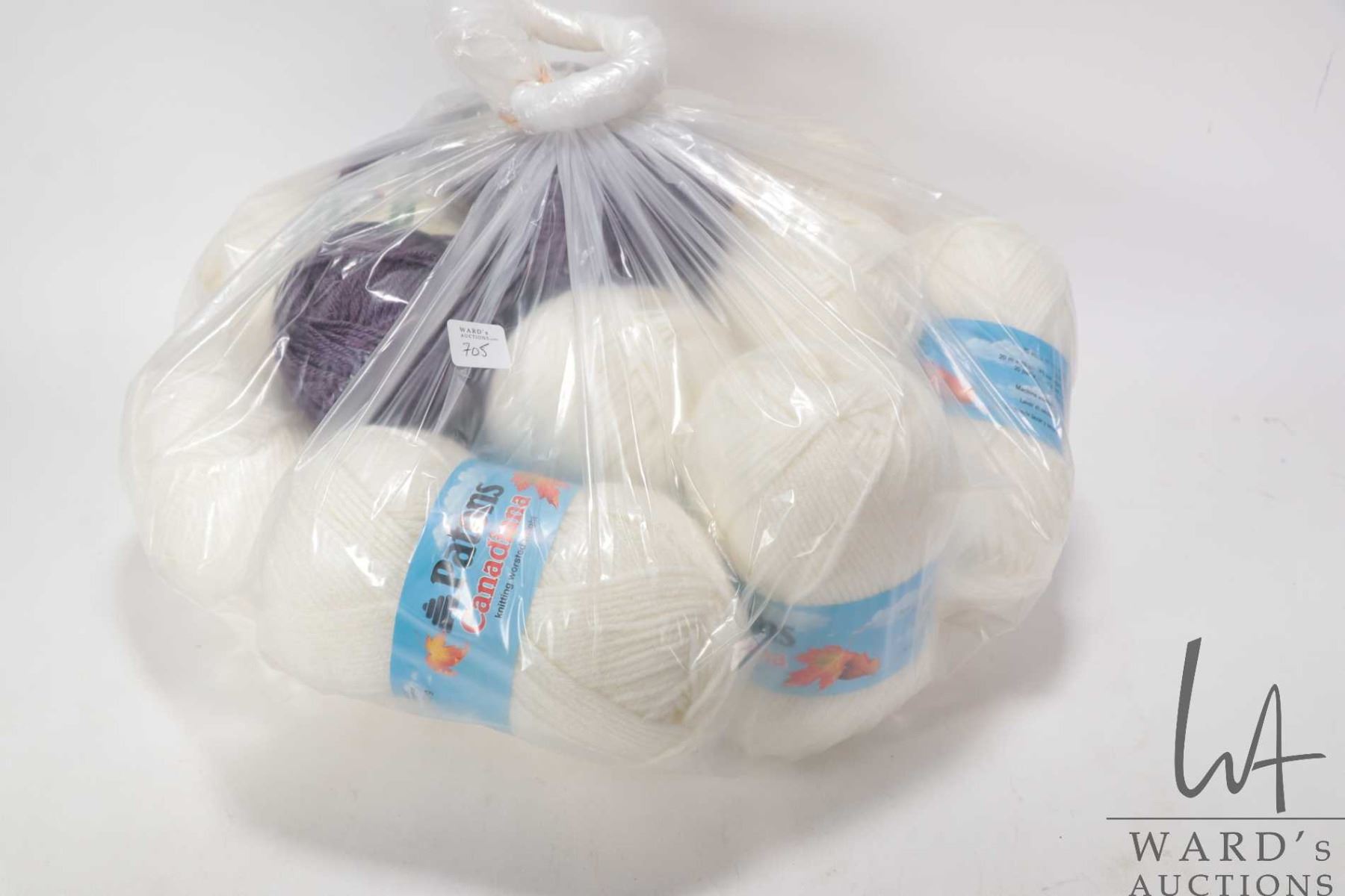 Ten balls of Patons Canadiana Winterwhite kniting worsted weight wool, two balls of Red Heart recycled blaned worsted medium wool and one ball of Cajun Cotton