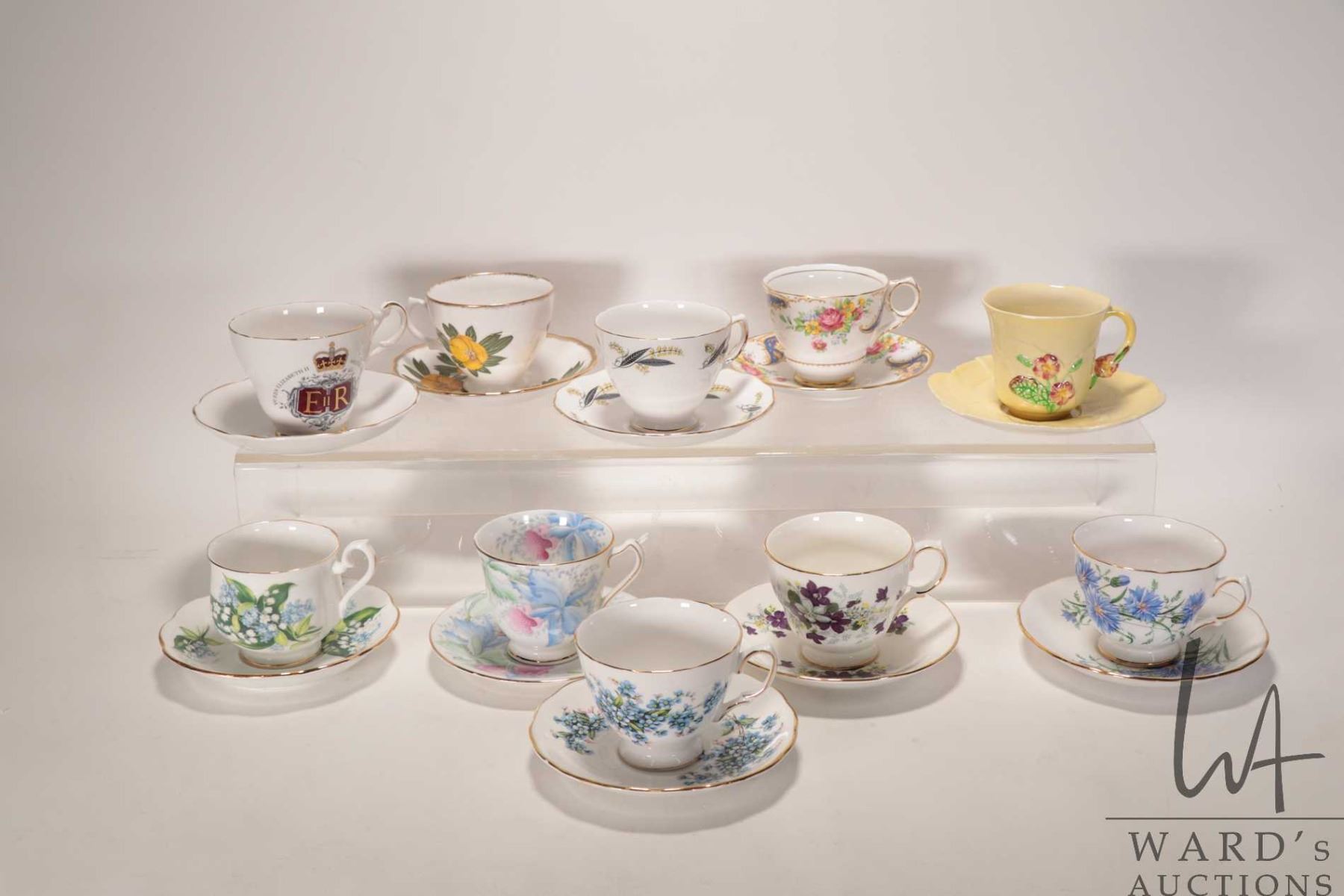 Ten china teacups and saucers including Royal Vale, Royal Albert, Bell, Carltonware etc.