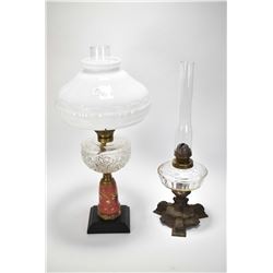 Two antique oil lamps each with cast bases and glass fonts. No shipping. Local pickup only