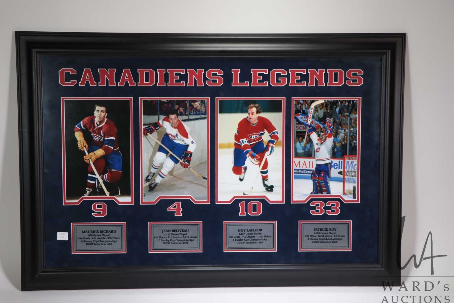 The Canadiens Legends framed photographics prints including Maurice Richard, Jean Beliveau, Guy LaFleur and Patrick Roy. Note: Not available for shipping. Local pickup only