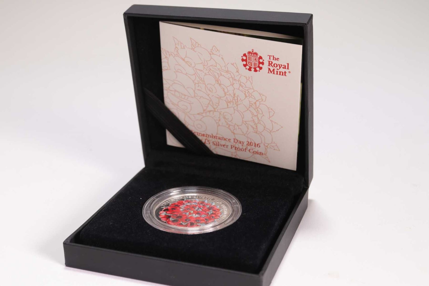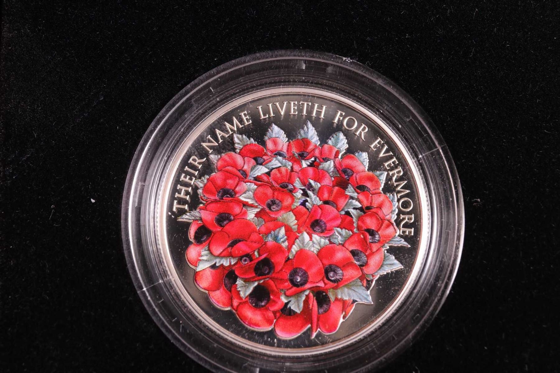 The Royal Mint 28.28 gram sterling silver 2018, 5 British sterling pounds "The Remembrance Day 2016 Alderney" proof coin with applied enamelled poppies