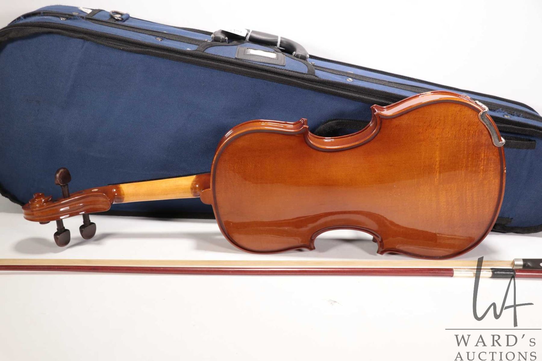 The Stentor Student One 4/4 violin with blue velvet lined hard case, includes case, bow and rosin. Note: violin missing one tuning peg and two string plus zipper on violin case is broken