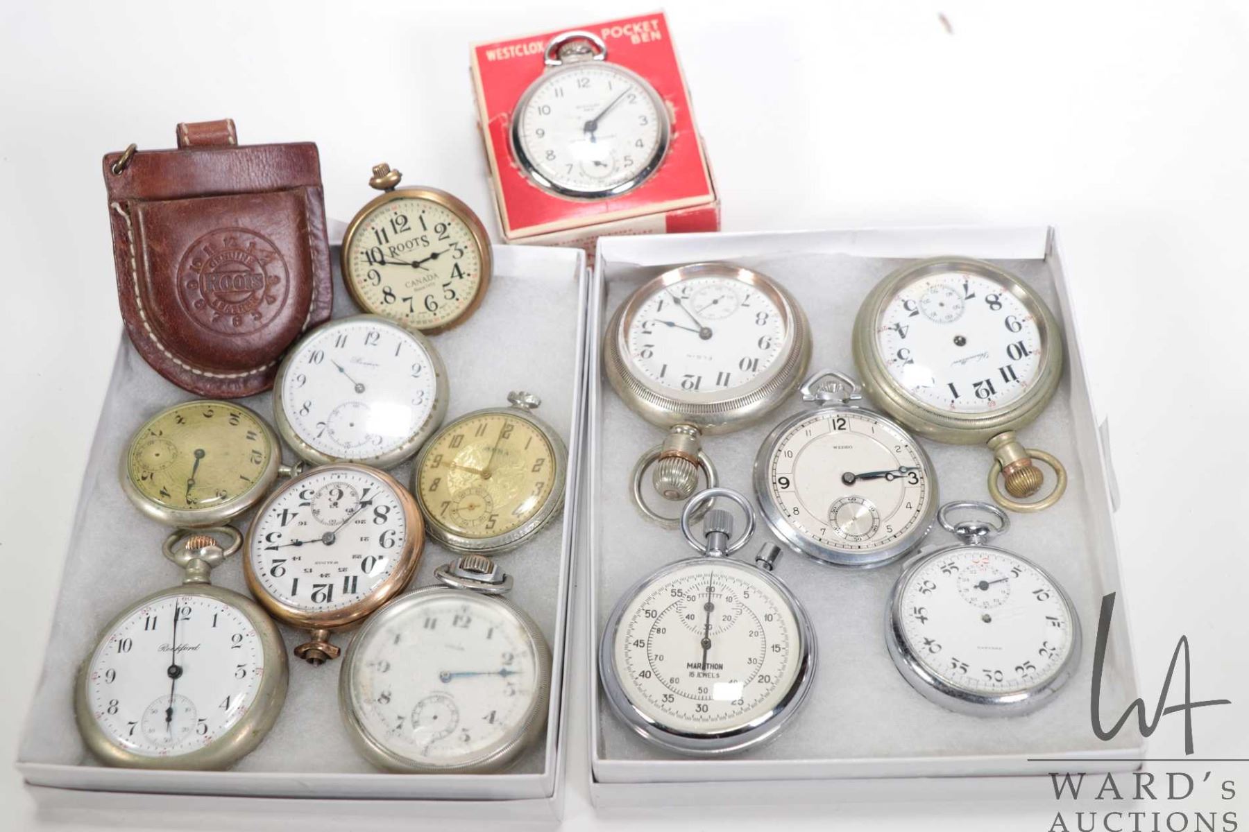 Thirteen vintage and collectible pocket watches for projects and parts including Roots, Wesclox in original box etc.